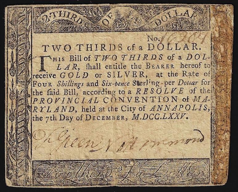 One December 7, 1775 $2/3 Maryland Colonial Currency Note.
