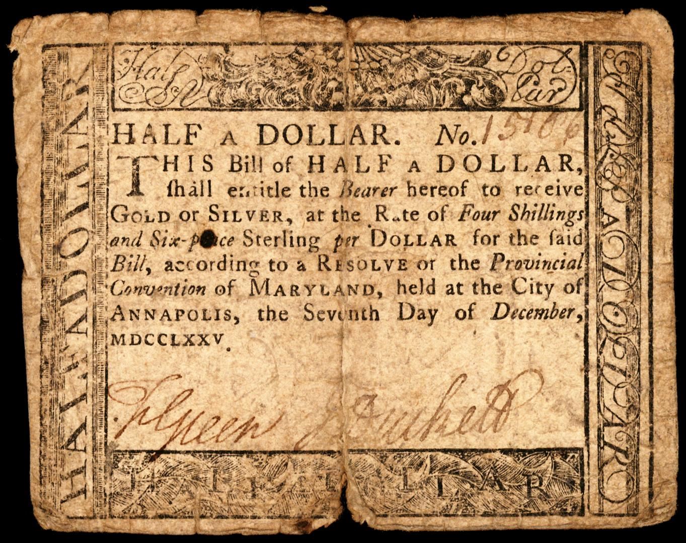 One December 7, 1775 Maryland $1/2 Colonial Currency Note.