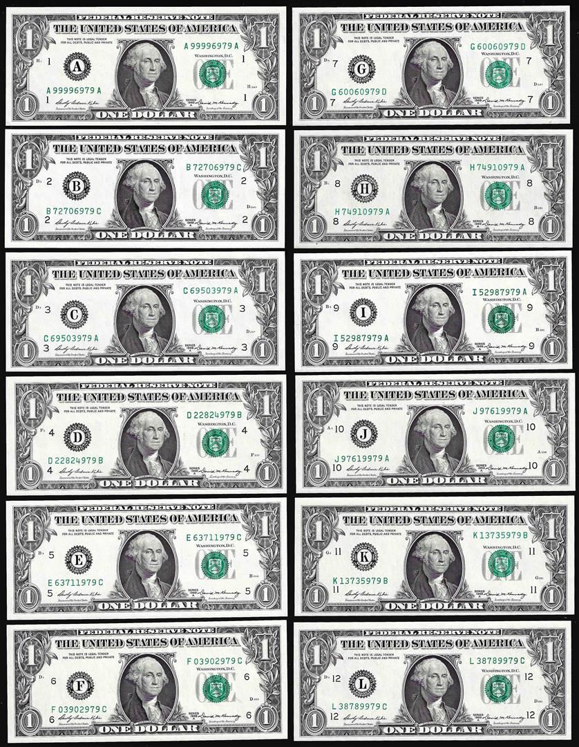 One District Set of (12) 1969A $1 Federal Reserve Notes.