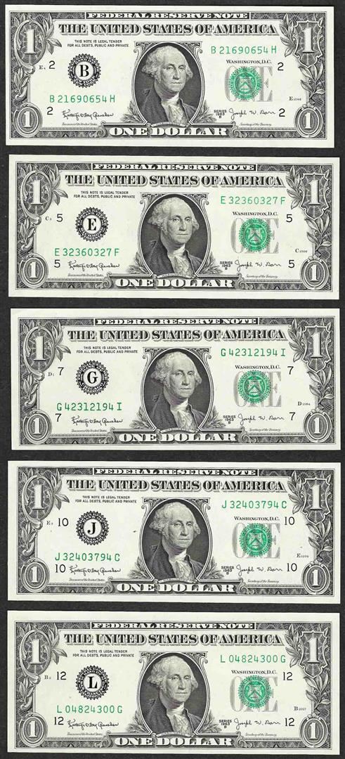 District Set of 1963B $1 Federal Reserve BARR Uncirculated Notes