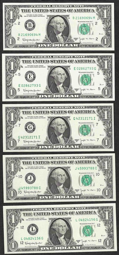 District Set of 1963B $1 Federal Reserve BARR Uncirculated Notes