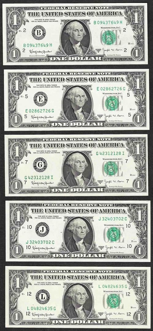 District Set of 1963B $1 Federal Reserve BARR Uncirculated Notes
