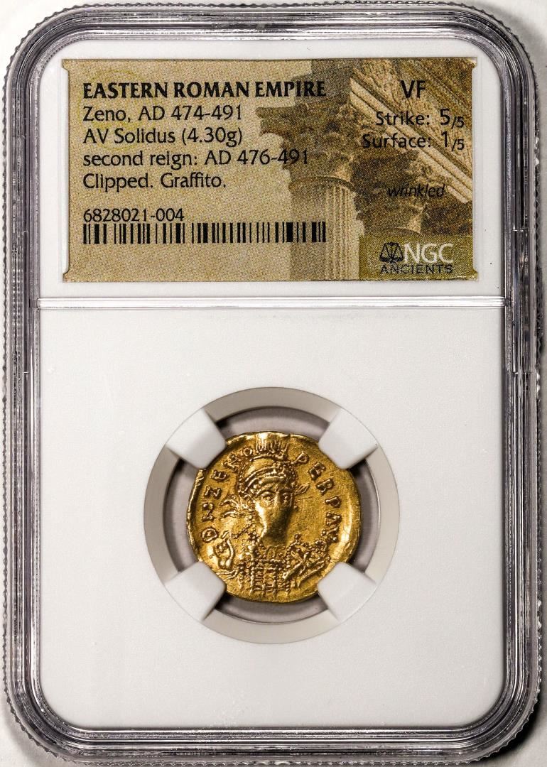 One Eastern Roman Empire 474-491 AD Zeno AV Solidus Ancient Gold Coin NGC VF. NGC Certified.
