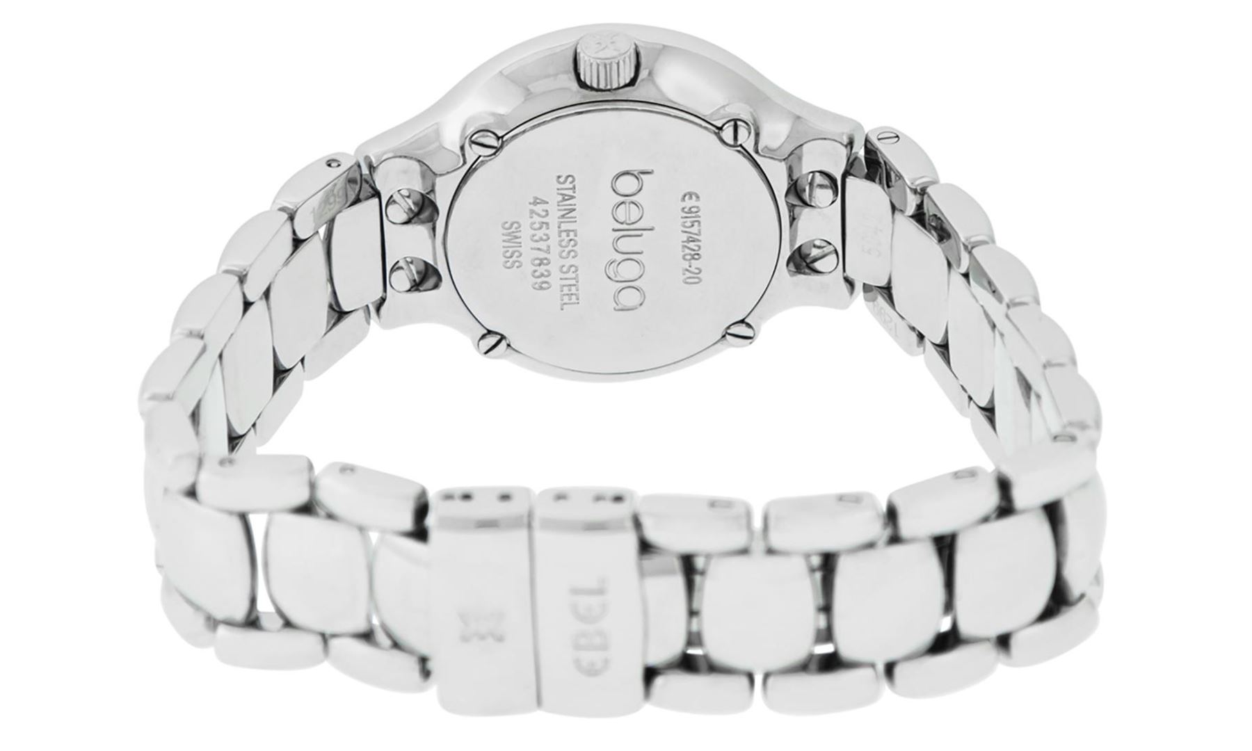 One Ladies Ebel Beluga Stainless Steel Polished Bright, This Watch Has Brand New Battery & Has Been Electronically Tested, Stainless Steel Case: 27mm, Stainless Steel Crown, Bezel: Stainless Steel Bezel set with 28 Brilliant Cut Round Diamonds, Crystal: Sapphire Crystal, Hands: Ebel Silver-tone Hands, Movement: Battery Operated Movement, Dial: Ebel Mother of Pearl Dial set with 8 Round Diamonds and 4 Roman Hour Markers, Model: Ebel Beluga. Condition: G-6 Extra Fine. Bracelet: Ebel Stainless Steel Bracelet. Bright Polish. Fits Up To 5.5 Inch Wrist, Adjustable Ebel Double Folding Stainless Steel Clasp, This Watch Has Time Tested And Is In Excellent Condition. It Is Free Of All Scratches And Dents.