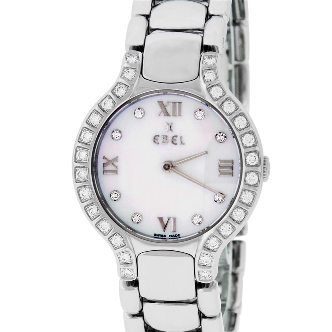 One Ladies Ebel Beluga Stainless Steel Polished Bright, This Watch Has Brand New Battery & Has Been Electronically Tested, Stainless Steel Case: 27mm, Stainless Steel Crown, Bezel: Stainless Steel Bezel set with 28 Brilliant Cut Round Diamonds, Crystal: Sapphire Crystal, Hands: Ebel Silver-tone Hands, Movement: Battery Operated Movement, Dial: Ebel Mother of Pearl Dial set with 8 Round Diamonds and 4 Roman Hour Markers, Model: Ebel Beluga. Condition: G-6 Extra Fine. Bracelet: Ebel Stainless Steel Bracelet. Bright Polish. Fits Up To 5.5 Inch Wrist, Adjustable Ebel Double Folding Stainless Steel Clasp, This Watch Has Time Tested And Is In Excellent Condition. It Is Free Of All Scratches And Dents.