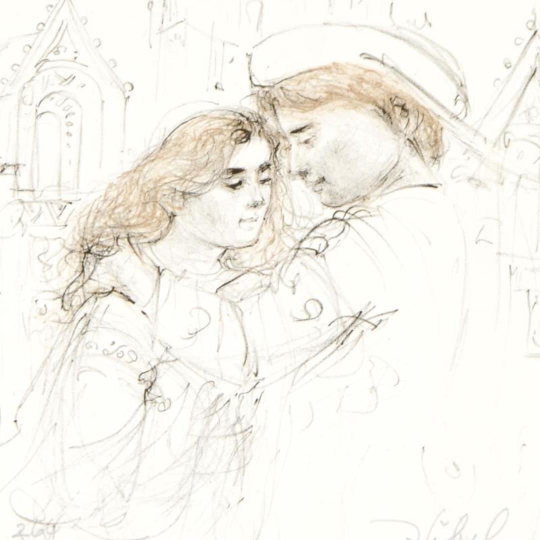 "Roberta and Roberto" is a limited edition lithograph on paper with remarque by Edna Hibel (1917-2014), numbered and hand signed by the artist. Includes Certificate of Authenticity. Measures approx. 5.5" x 8.5" (image).