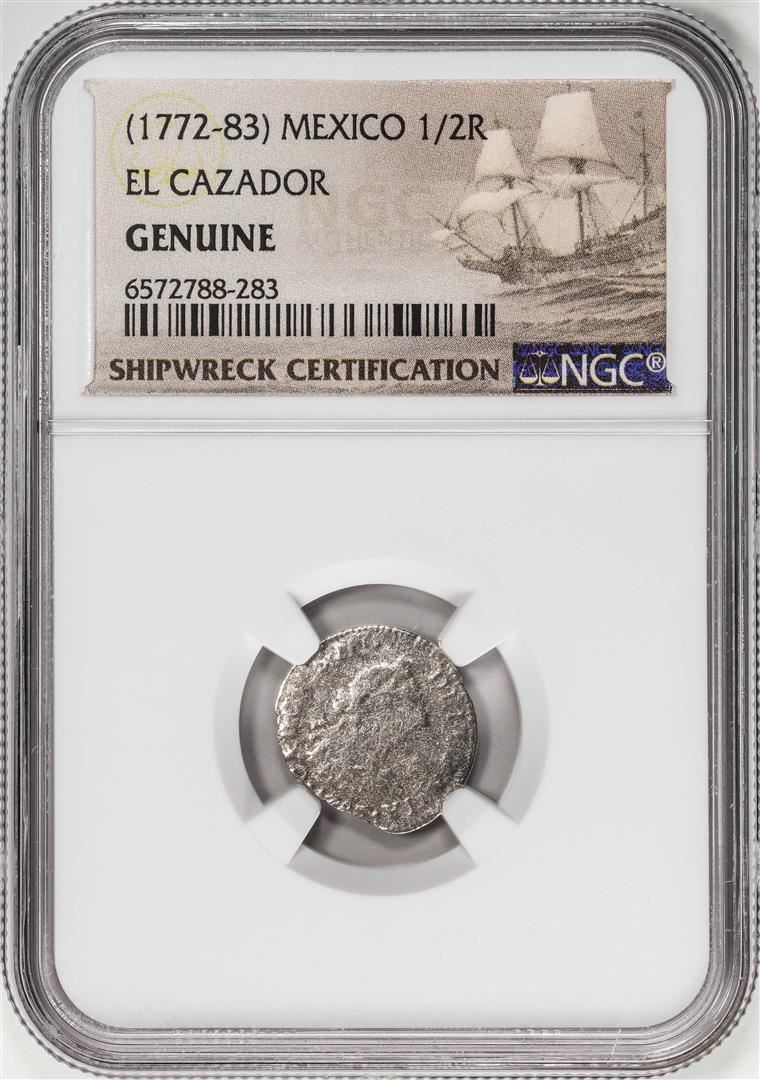 El Cazador Shipwreck (1772-83) Mexico 1/2 Real Silver Coin NGC Genuine w/ Story Card