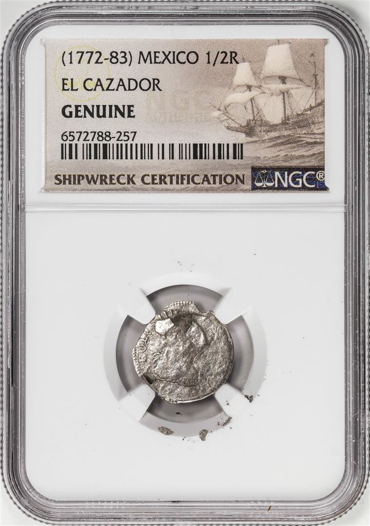 One El Cazador Shipwreck (1772-83) Mexico 1/2 Real Silver Coin NGC Genuine w/ Story Card. NGC Certified.