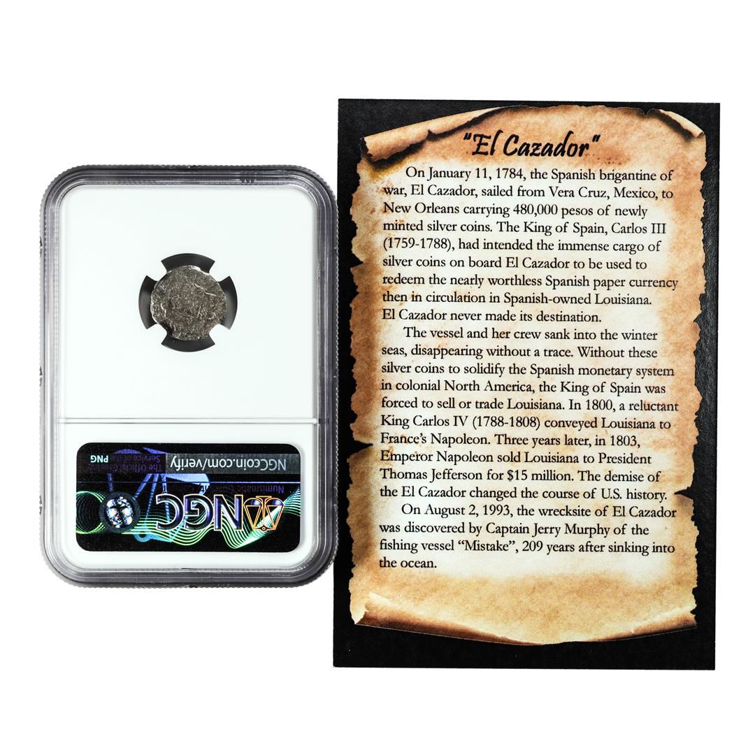 El Cazador Shipwreck (1772-83) Mexico 1/2 Real Silver Coin NGC Genuine w/ Story Card