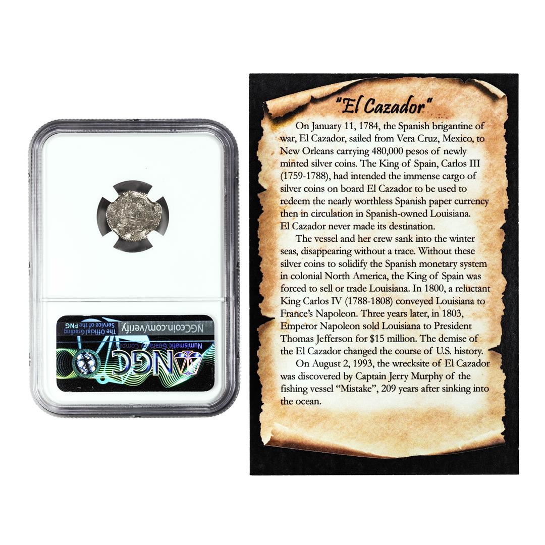 El Cazador Shipwreck (1772-83) Mexico 1/2 Real Silver Coin NGC Genuine w/ Story Card