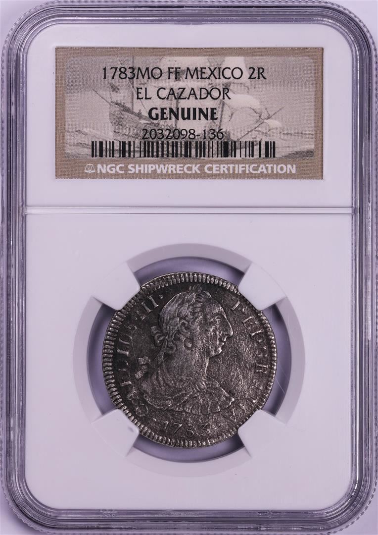 One El Cazador Shipwreck 1783Mo FF Mexico 2 Reales Silver Coin NGC Genuine. NGC Certified.