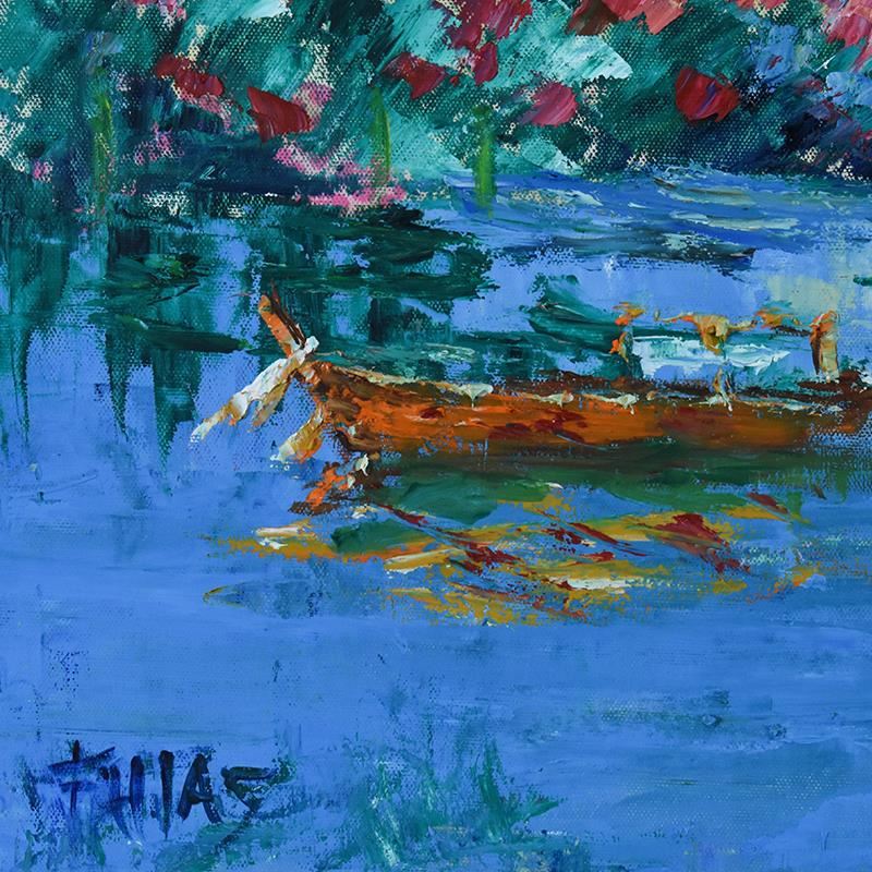 "Tropical Holiday" is an original oil painting on stretched canvas wrapped around board by Elliot Fallas, hand signed by the artist. Includes Letter of Authenticity. Measures approx. 18" x 18" (image). The sides of the canvas are painted and it can be hung as is, but a frame is definitely recommended.