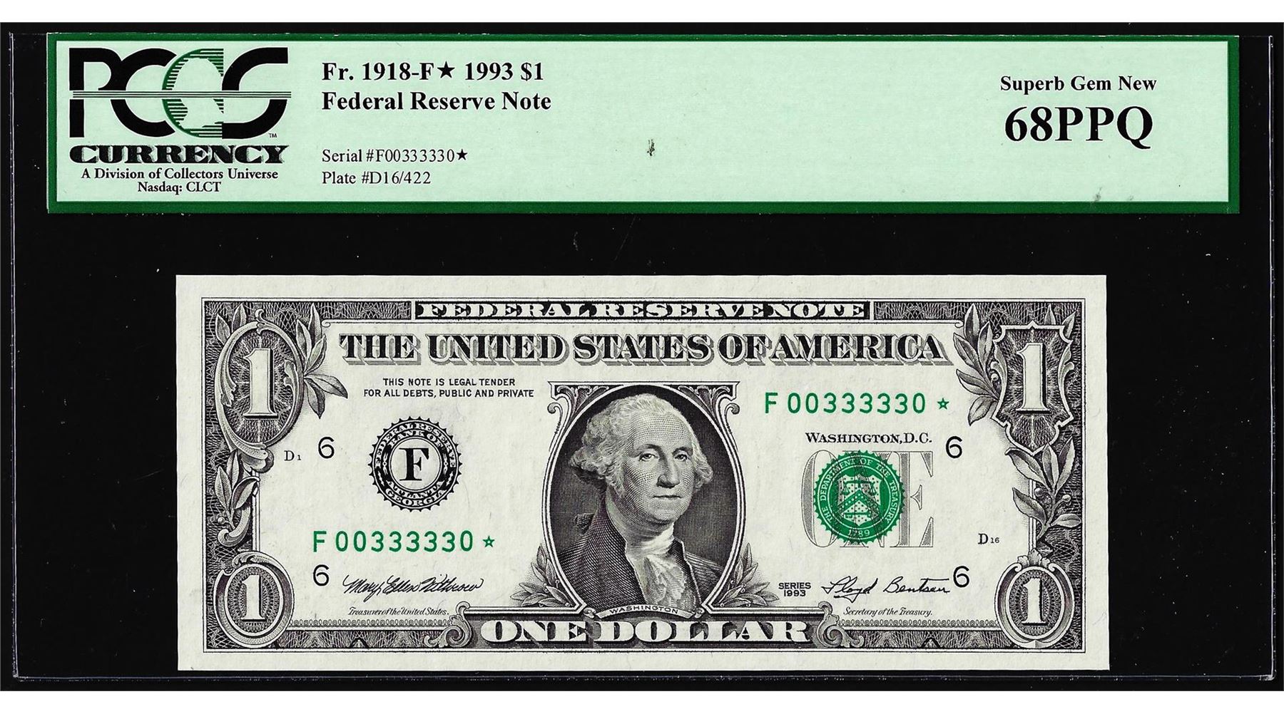 Fancy Serial # 1993 $1 Federal Reserve STAR Note Fr.1918-F* PCGS Superb Gem New 68PPQ