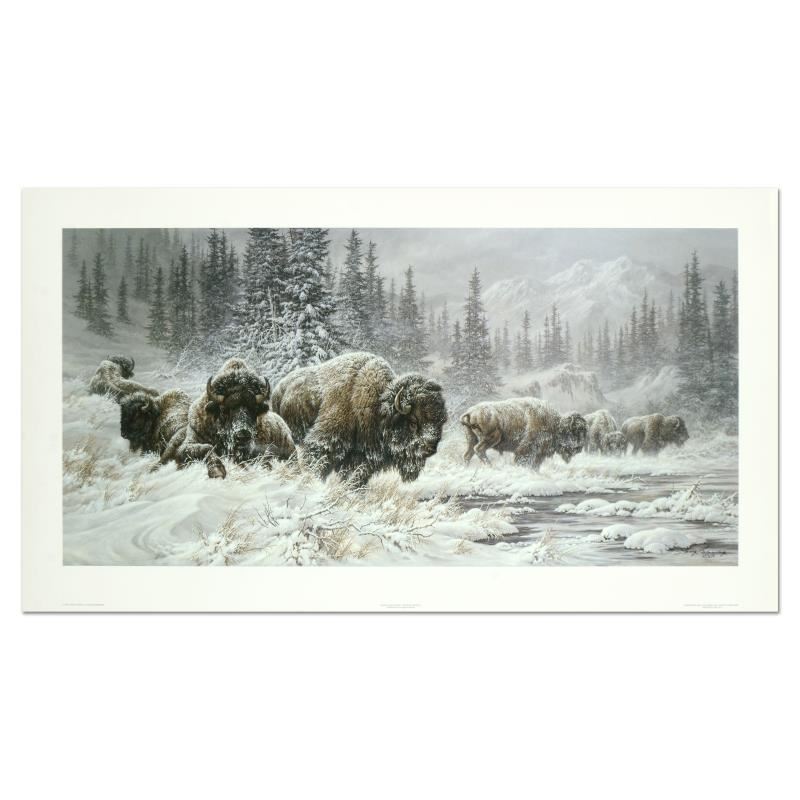 "Front Range Storm - Colorado Buffalo" is a limited edition lithograph on paper by Larry Fanning (1938-2014), numbered and hand signed with a Letter of Authenticity. Measures approximately 36" x 20" (image).