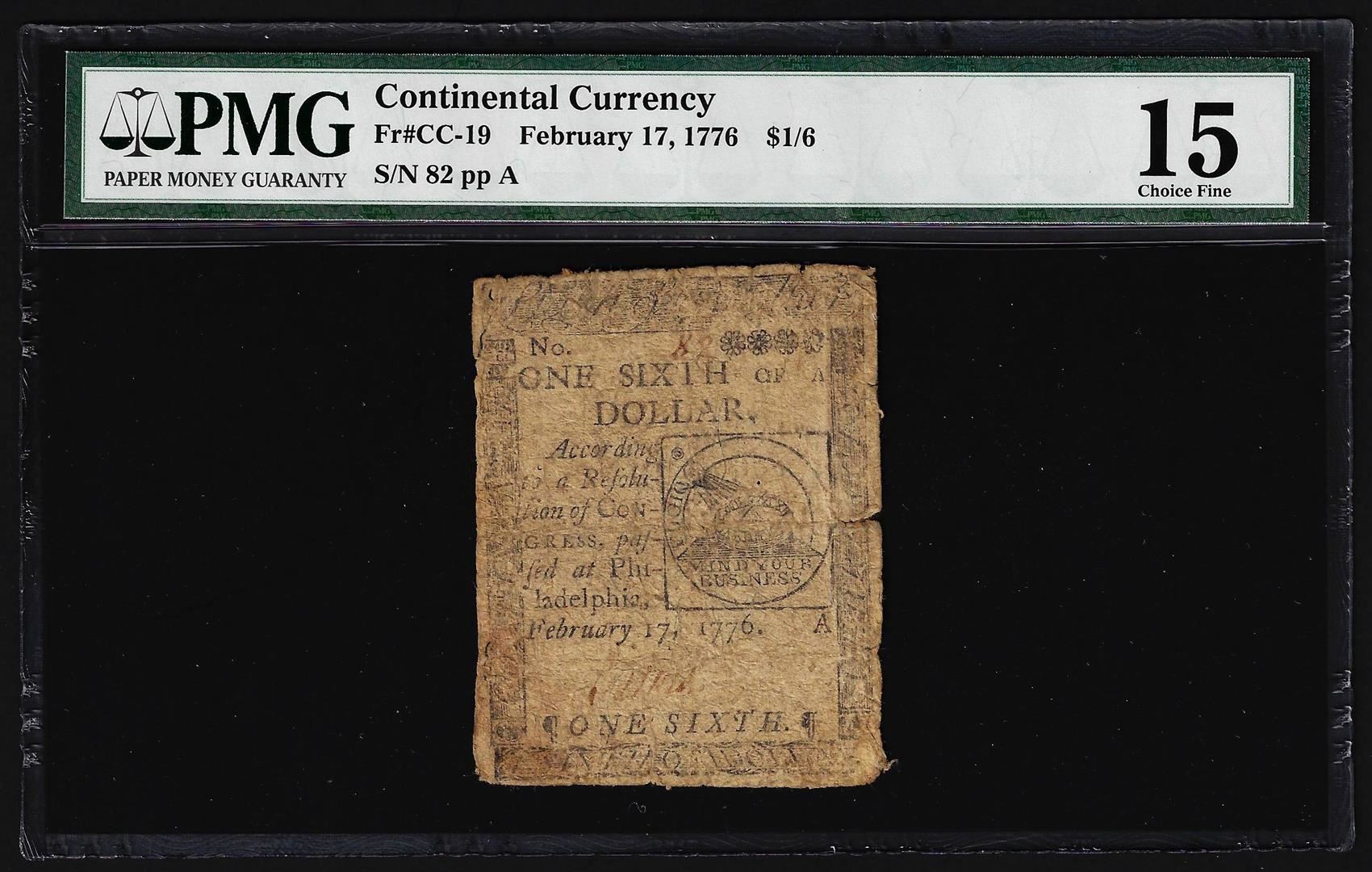 One February 17, 1776 $1/6 Continental Currency Note PMG Choice Fine 15. PMG Certified.