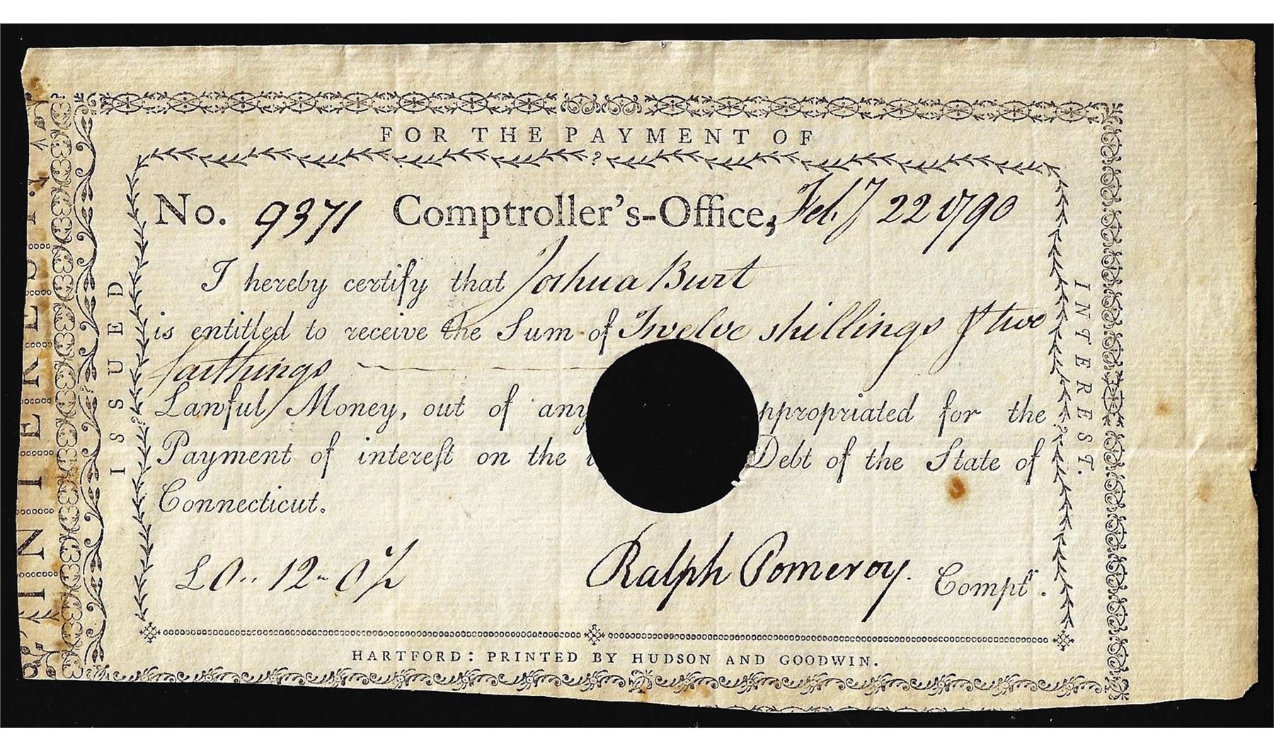 February 22, 1790 State of Connecticut Interest Certificate Colonial Note