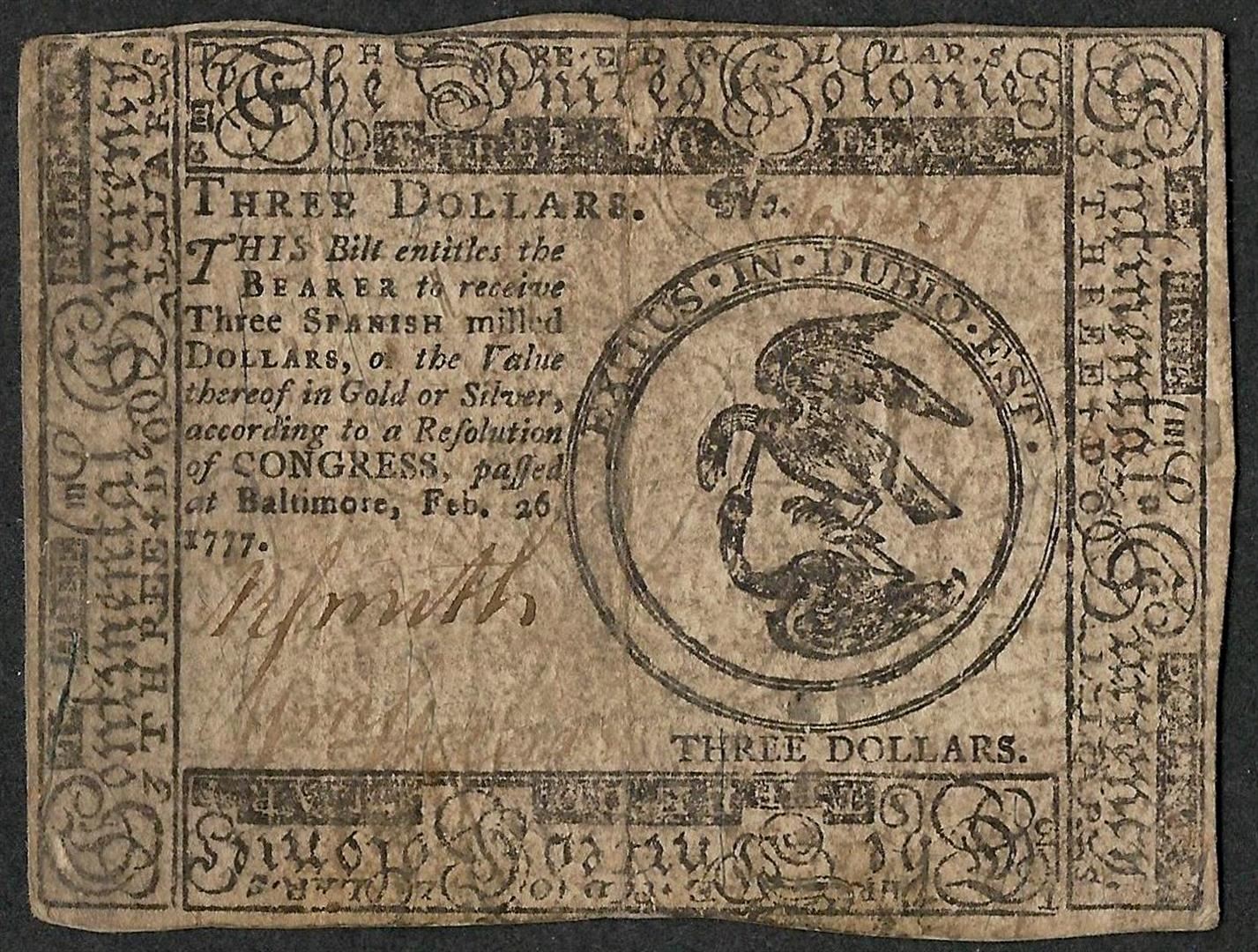 One February 26, 1777 $3 Continental Currency Note.