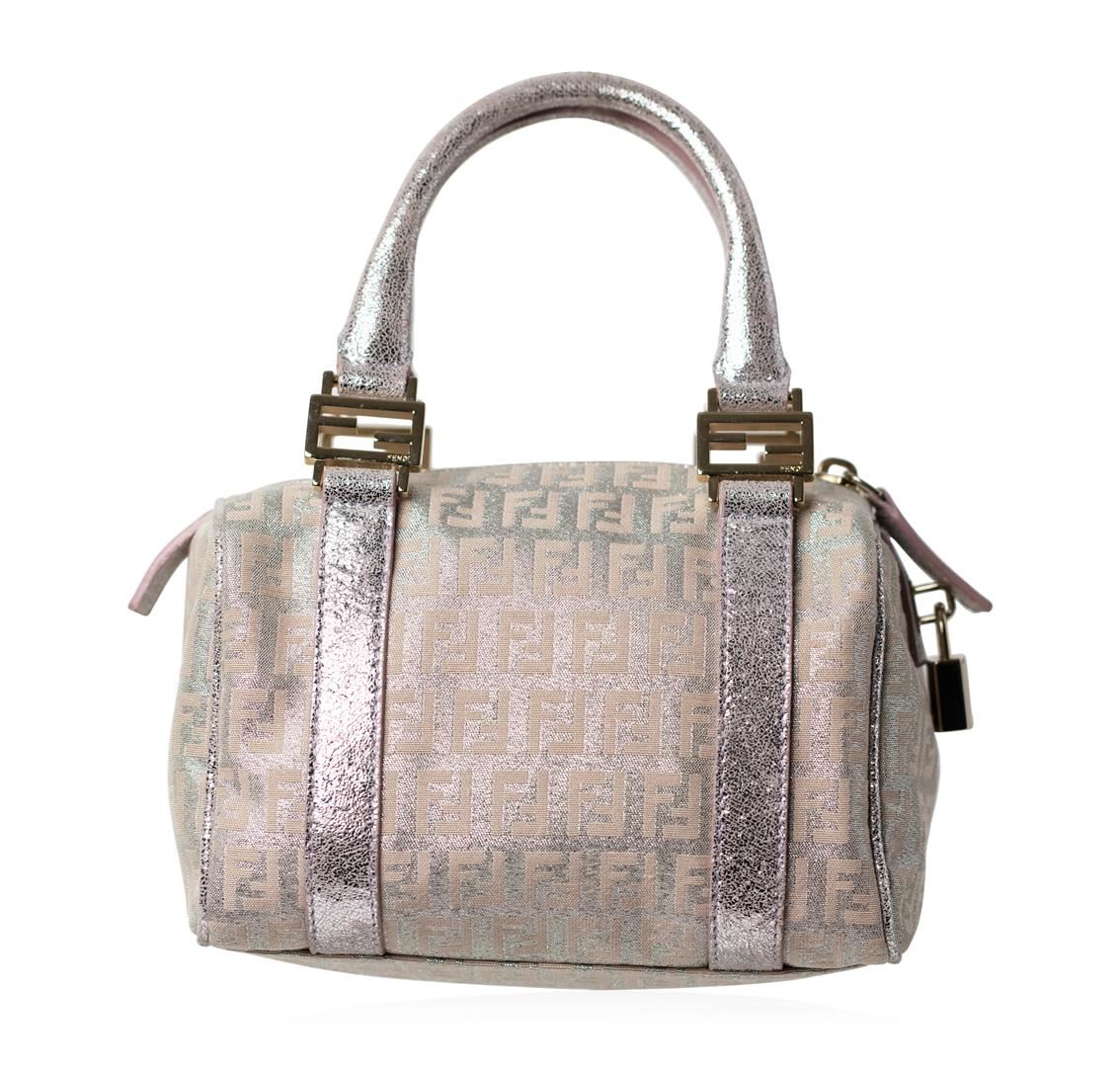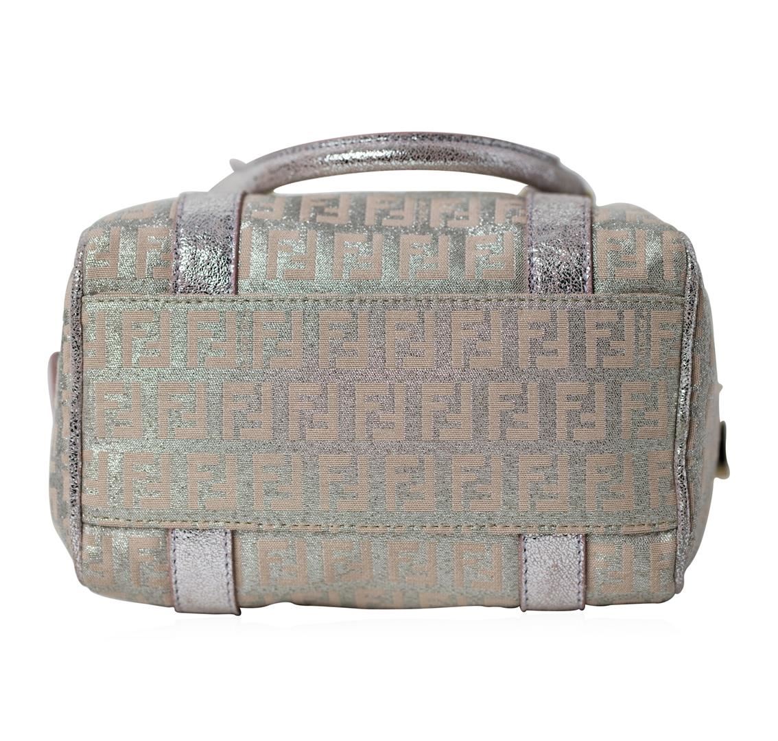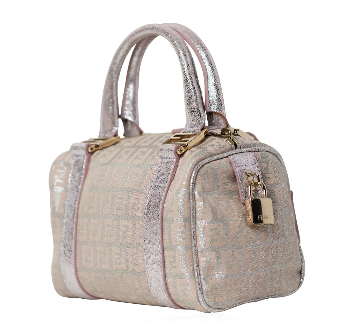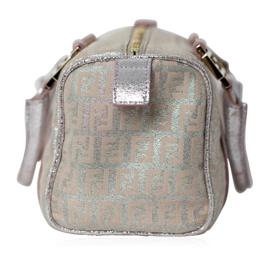 Authentic and stylish Fendi Pink Metallic Zucca Canvas Mini Boston Boulotto Bag features all over "FF" Fendi logo shimmery textile, metallic pink and silver leather trim. The top handles are secured with brushed gold-tone Zucca rings and a Fendi padlock sits at the side which still has the protective plastic. The bag also comes with a clochette and two keys. A fabulous accessory for day or night. Interior features luxurious baby pink satin lining and an open pocket with a golden "Fendi" medallion with the protective plastic. Condition is like-new. Comes complete with Fendi tag. Approximate dimensions: 7.5" x 4.5" x 4.5" with 4" handle drop.