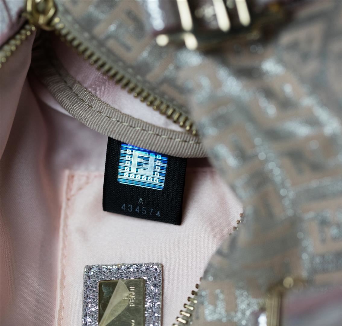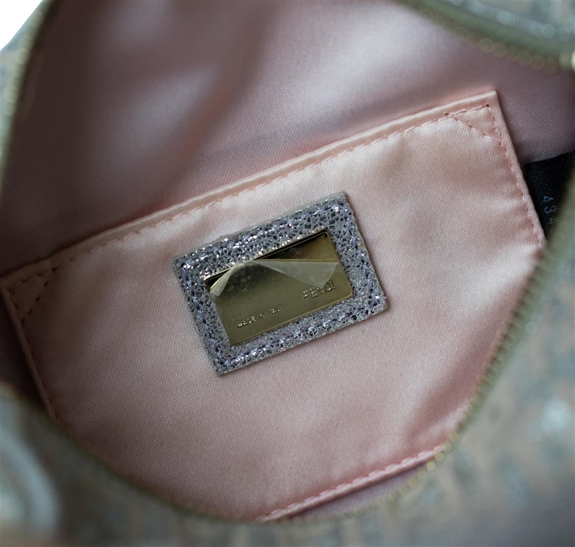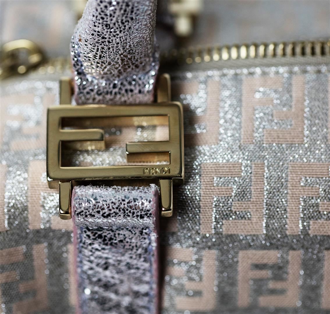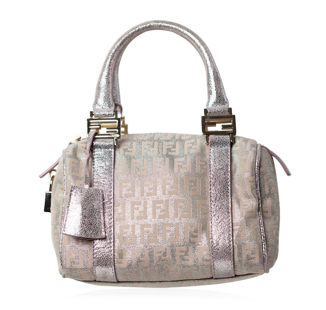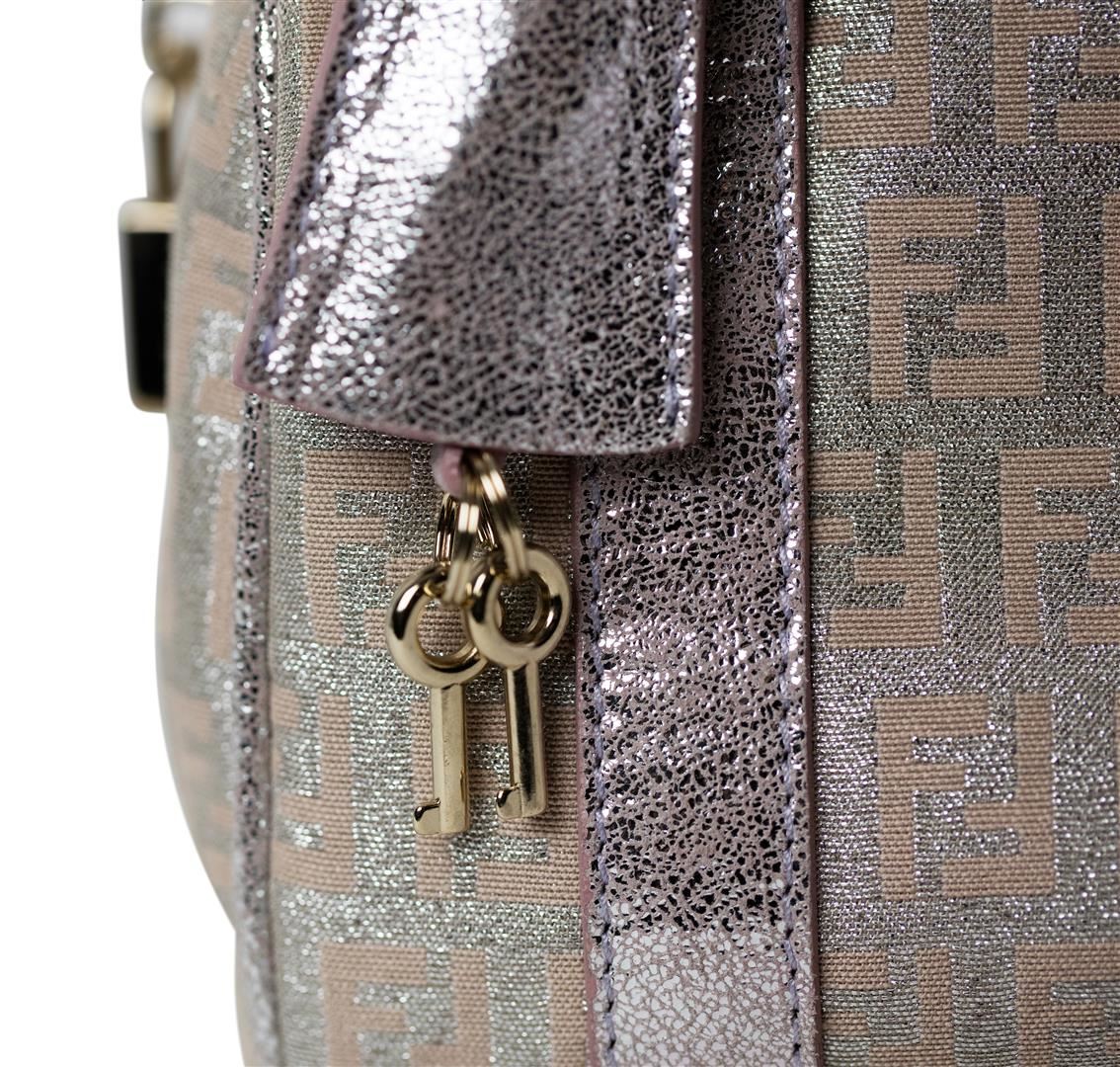 Authentic and stylish Fendi Pink Metallic Zucca Canvas Mini Boston Boulotto Bag features all over "FF" Fendi logo shimmery textile, metallic pink and silver leather trim. The top handles are secured with brushed gold-tone Zucca rings and a Fendi padlock sits at the side which still has the protective plastic. The bag also comes with a clochette and two keys. A fabulous accessory for day or night. Interior features luxurious baby pink satin lining and an open pocket with a golden "Fendi" medallion with the protective plastic. Condition is like-new. Comes complete with Fendi tag. Approximate dimensions: 7.5" x 4.5" x 4.5" with 4" handle drop.