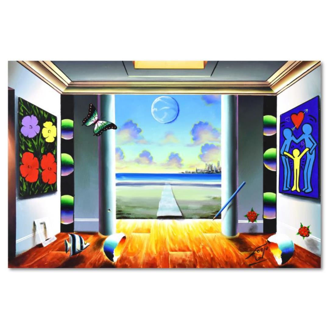 "Haring and Warhol Family" is an original oil painting on stretched canvas by Ferjo, hand signed by the artist. Includes Letter of Authenticity. Measures approx. 36" x 24" (image).