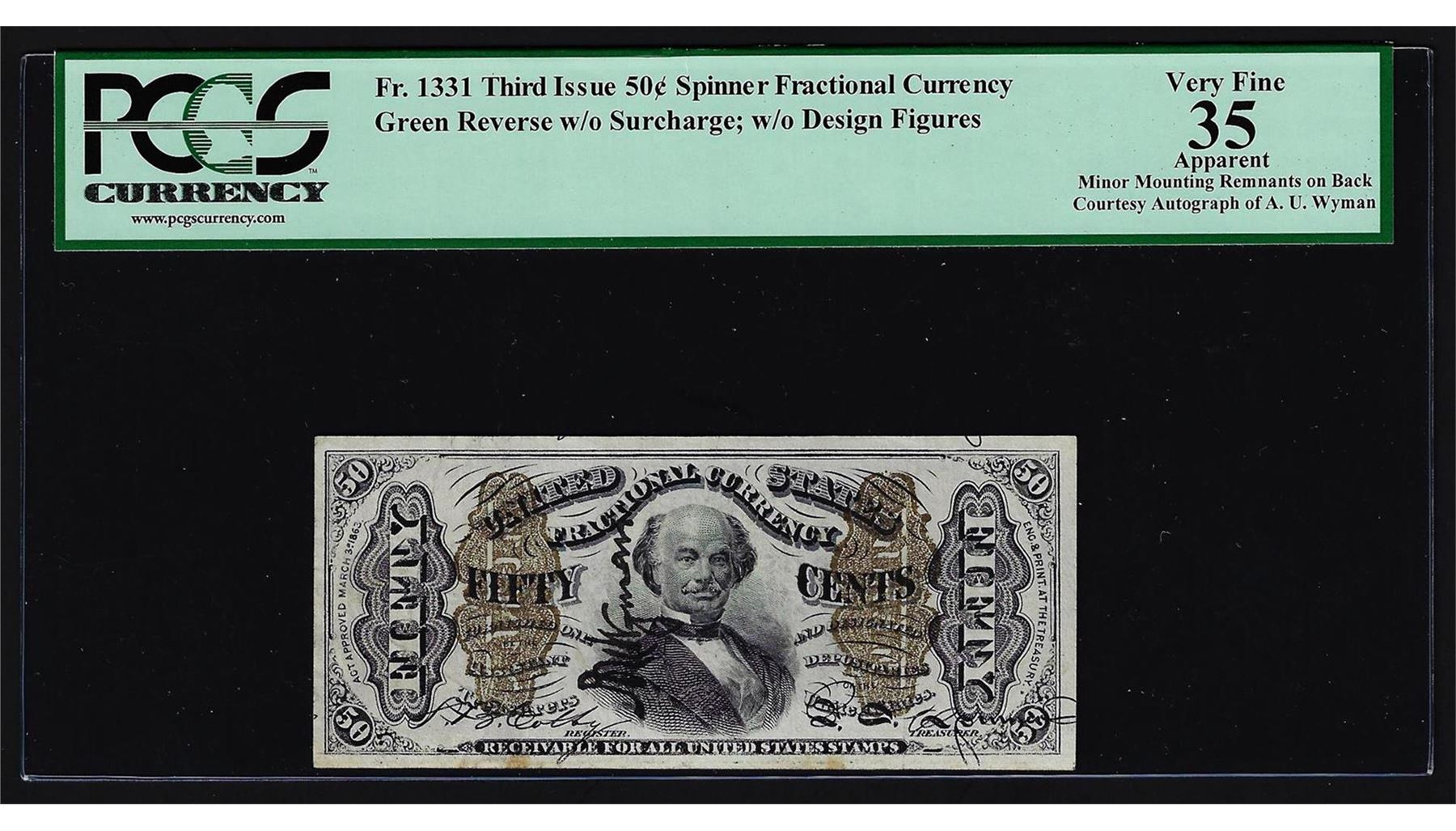 One Fifty Cent Third Issue Fractional Currency Note PCGS VF35 Courtesy Auto of A.U. Wyman. PCGS Graded.
