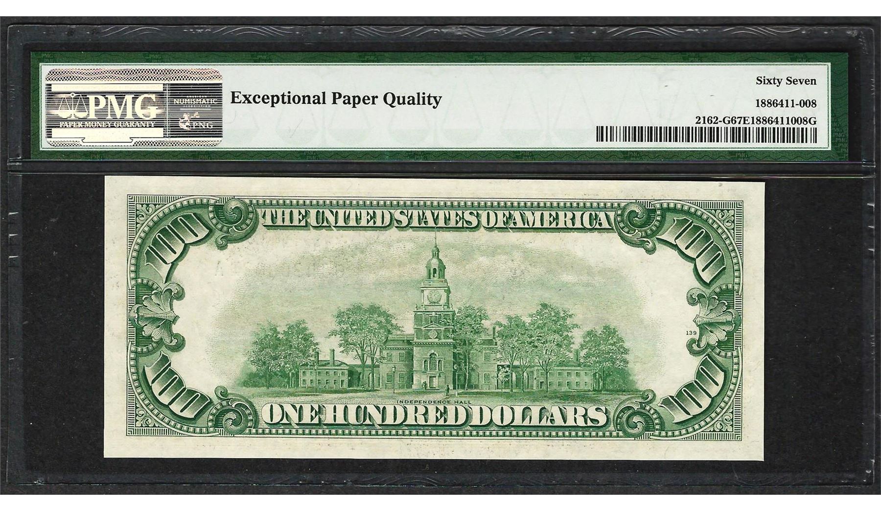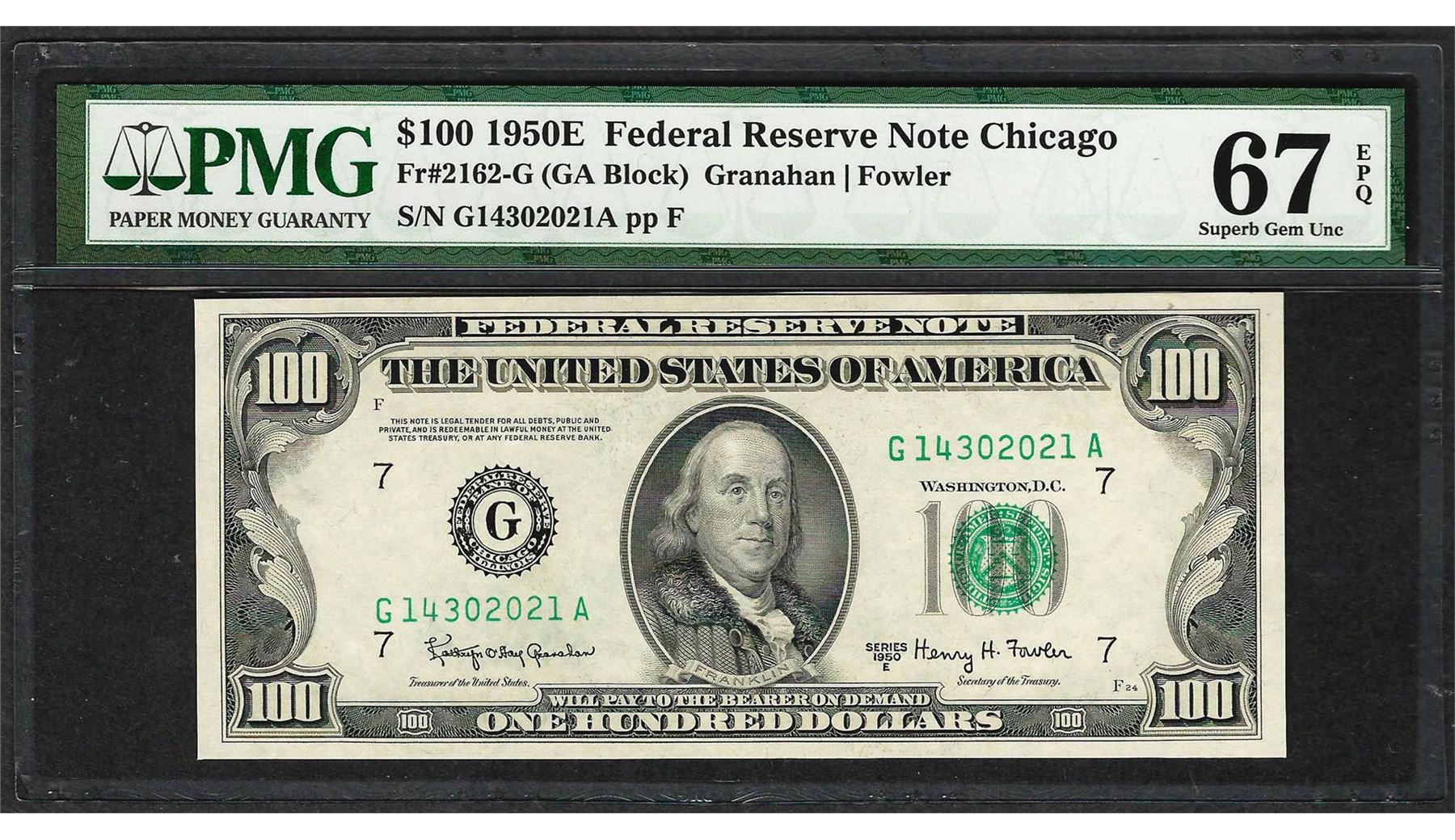 One 1950E $100 Federal Reserve Note Chicago Fr.2162-G PMG Superb Gem Uncirculated 67EPQ. A nicely margined, pack-fresh note that is the finest known example for this popular series currently graded at PMG. PMG Certified.