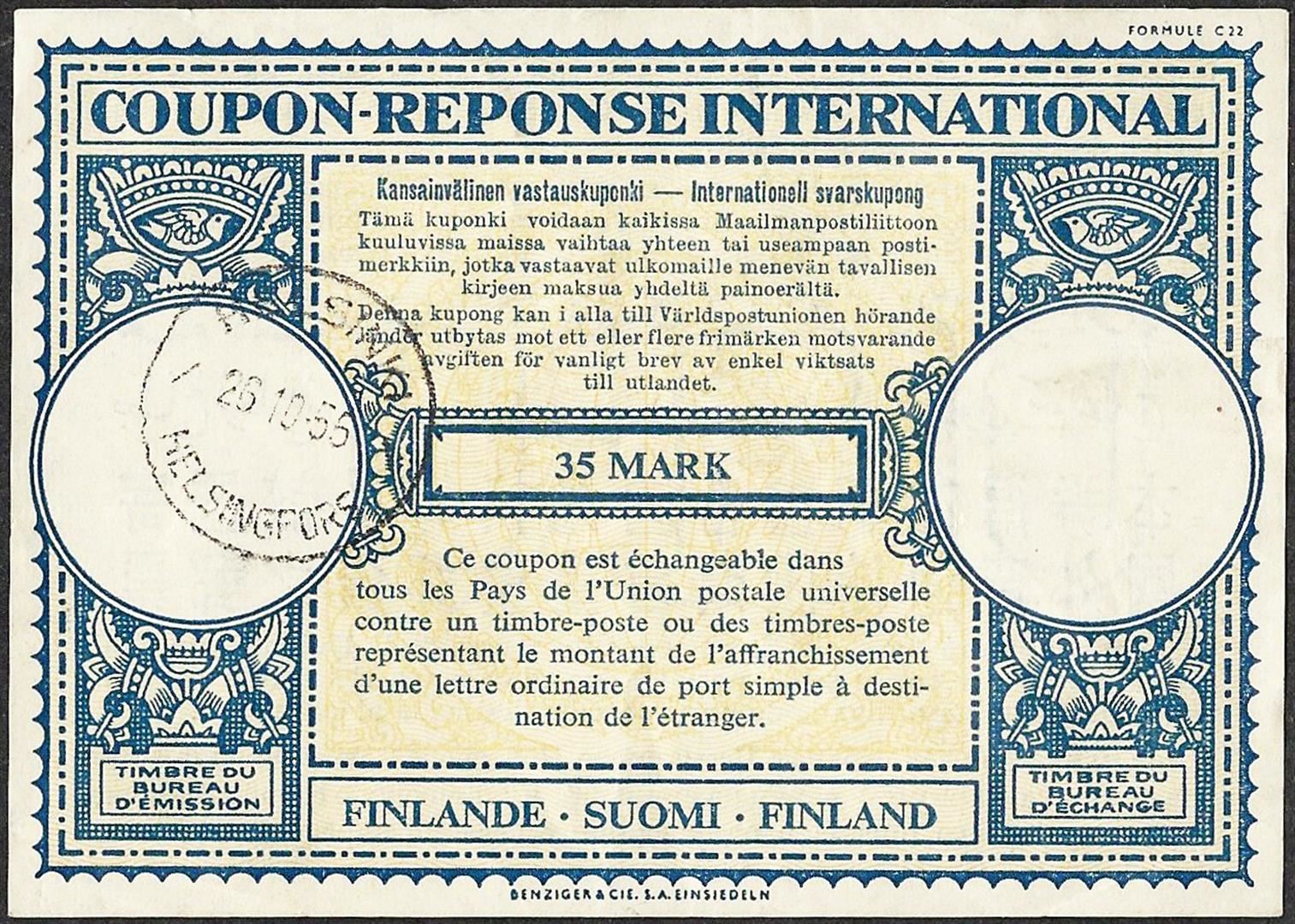 One Finland Coupon-Response International 35 Mark Currency Note.