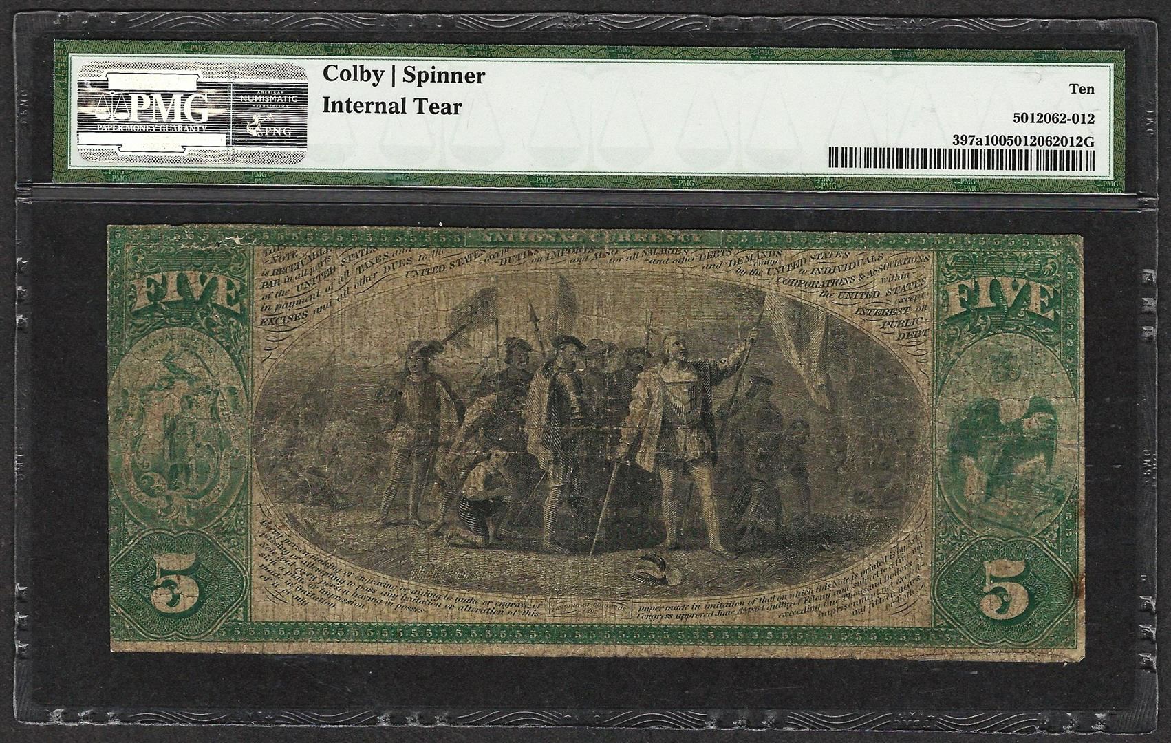 One First Series $5 National Reserve Bank Boston, MA CH# 1295 National Currency Note PMG Graded Very Good 10. The founders of this bank capitalized on the popularity of Paul Revere's name when choosing the title for their National Bank in 1865 and kept the title until the bank closed in 1898. This is one of only two Original Series $5s in the census and, though well circulated, displays pleasing color and bold pen signatures. PMG Certified.