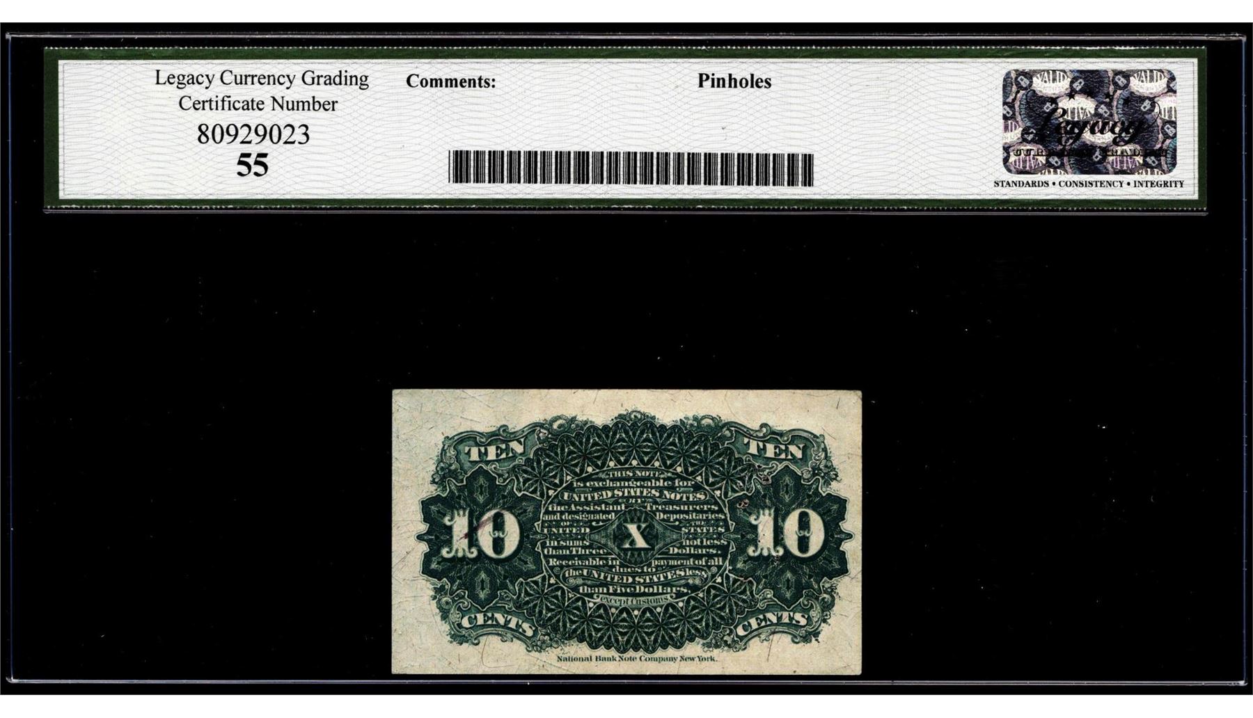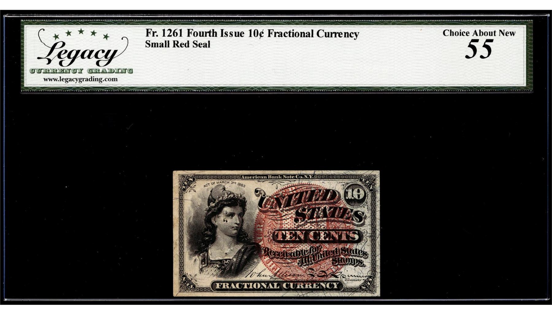 One Fourth Issue 10 Cents Fractional Currency Note Fr.1261 Legacy Choice About New 55. Legacy Graded.