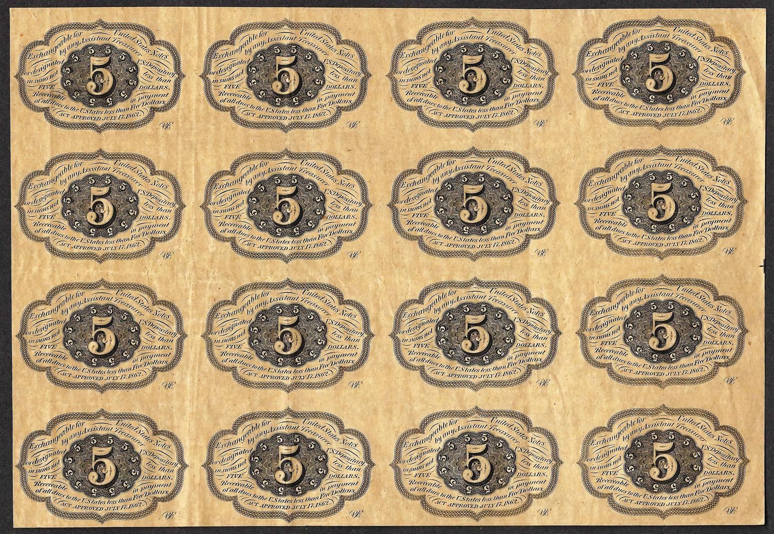 One Fr.1230 Uncut Sheet of (16) 1862 First Issue Five Cents Fractional Currency Notes.