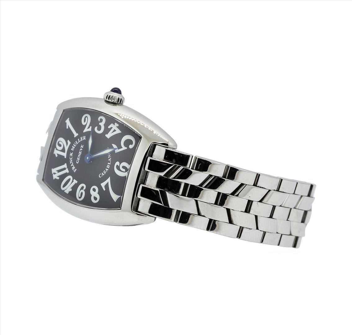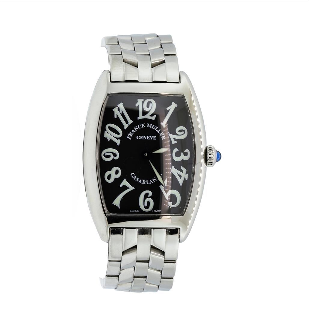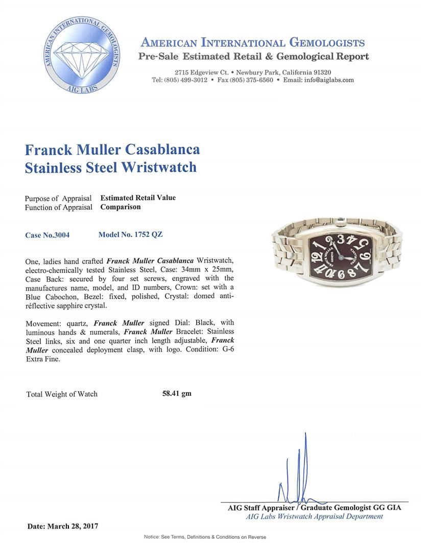 One, custom cast & hand crafted Franck Muller Casablanca Wristwatch, electro-chemically tested Stainless Steel, Case: 34mm x 25mm, Case Back: secured by four set screws, engraved with the manufactures name, model, and ID numbers, Crown: set with a Blue Cabochon, Bezel: fixed, polished, Crystal: domed anti-reflective sapphire crystal. Movement: quartz, Franck Muller signed Dial: Black, with luminous hands & numerals, Franck Muller Bracelet: Stainless Steel links, six and one quarter inch length adjustable, Franck Muller concealed deployment clasp, with logo. Condition: G-6 Extra Fine. Total Weight of Watch 58.41gm. AIG Appraised.