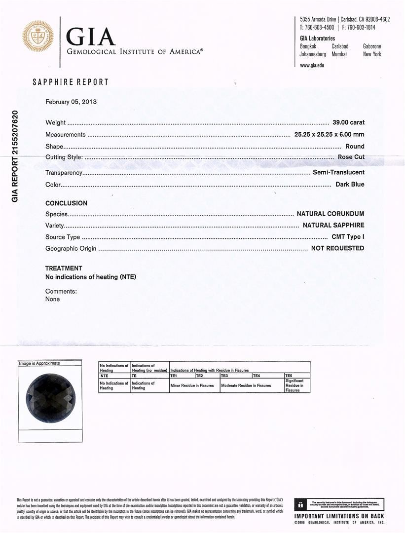 Weight: 39.00 Carat, Measurements: 25.25 X 25.25 X 6.00 Mm, Shape: Round, Cutting Style: Rose Cut, Transparency: Semi-Translucent, Color: Dark Blue, Species: Natural Corundum, Variety: Natural Sapphire, Source Type: Cmt Type, Treatment: No Indications Of Heating (Nte). GIA Appraised.