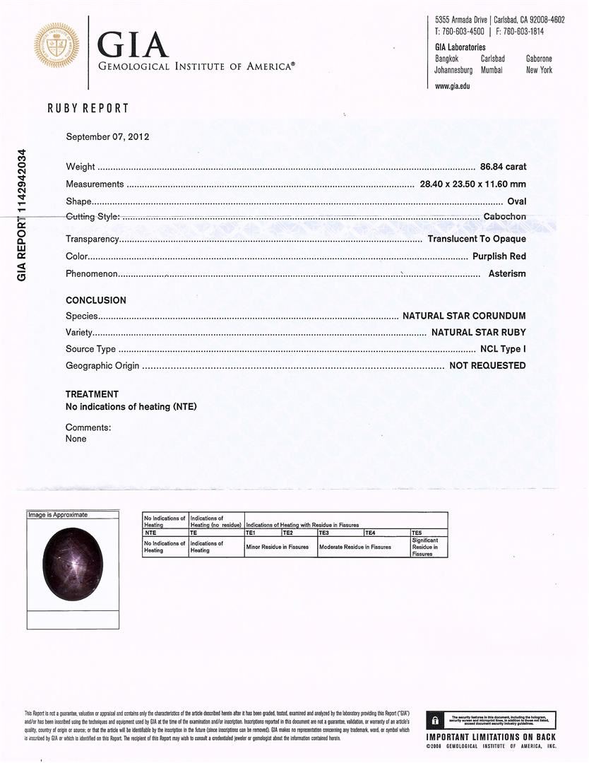 Gia Ruby Report. Weight: 88.84 Carat, Measurements: 28.40 X 23.50 X 11.60 Mm, Shape: Oval, Cutting Style: Cabochon, Transparency: Translucent To Opaque, Color: Purplish Red, Phenomenon: Asterism. Conclusion: Species: Natural Star Corundum, Variety: Natural Star Ruby, Source Type: Ncl Type 1, Treatment: No Indications Of Heating. GIA Appraised.