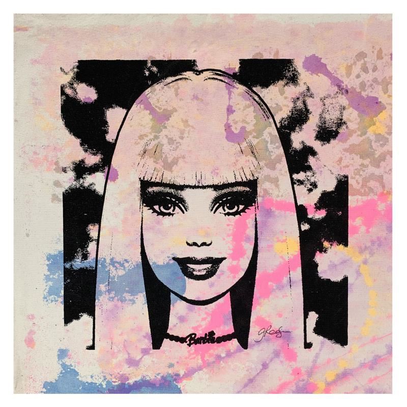 "Barbie" is an original hand pulled silkscreen and acrylic painting on canvas by Gail Rodgers. Hand signed by the artist, the piece comes with a letter of authenticity. This piece is meant to be gallery wrapped and measure approximately 23" x 23" and image dimensions (after stretching) 16" x 16" (image).