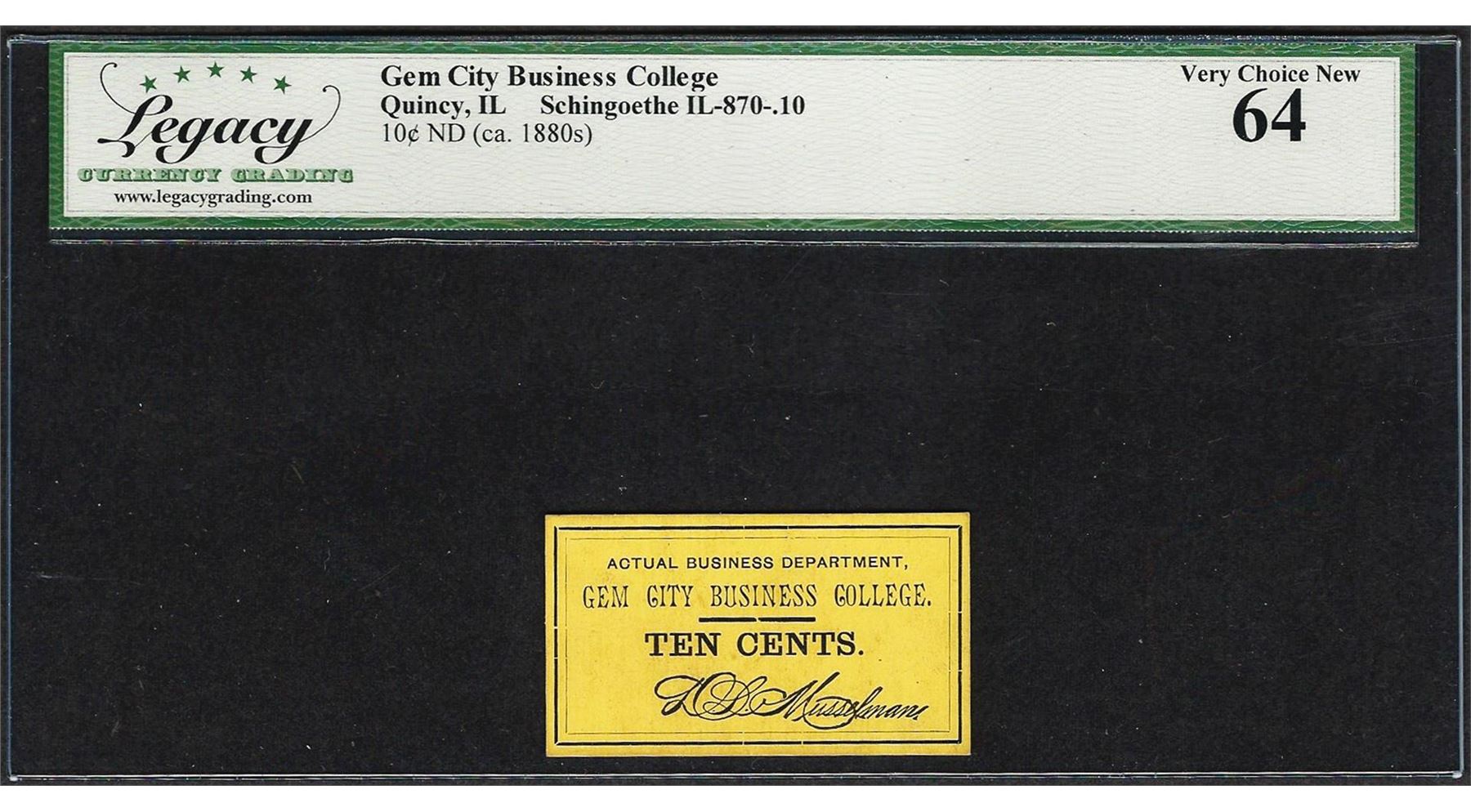 One Gem City Business College 10 Cents Quincy, IL Obsolete Note Legacy Very Ch. New 64. Legacy Graded.
