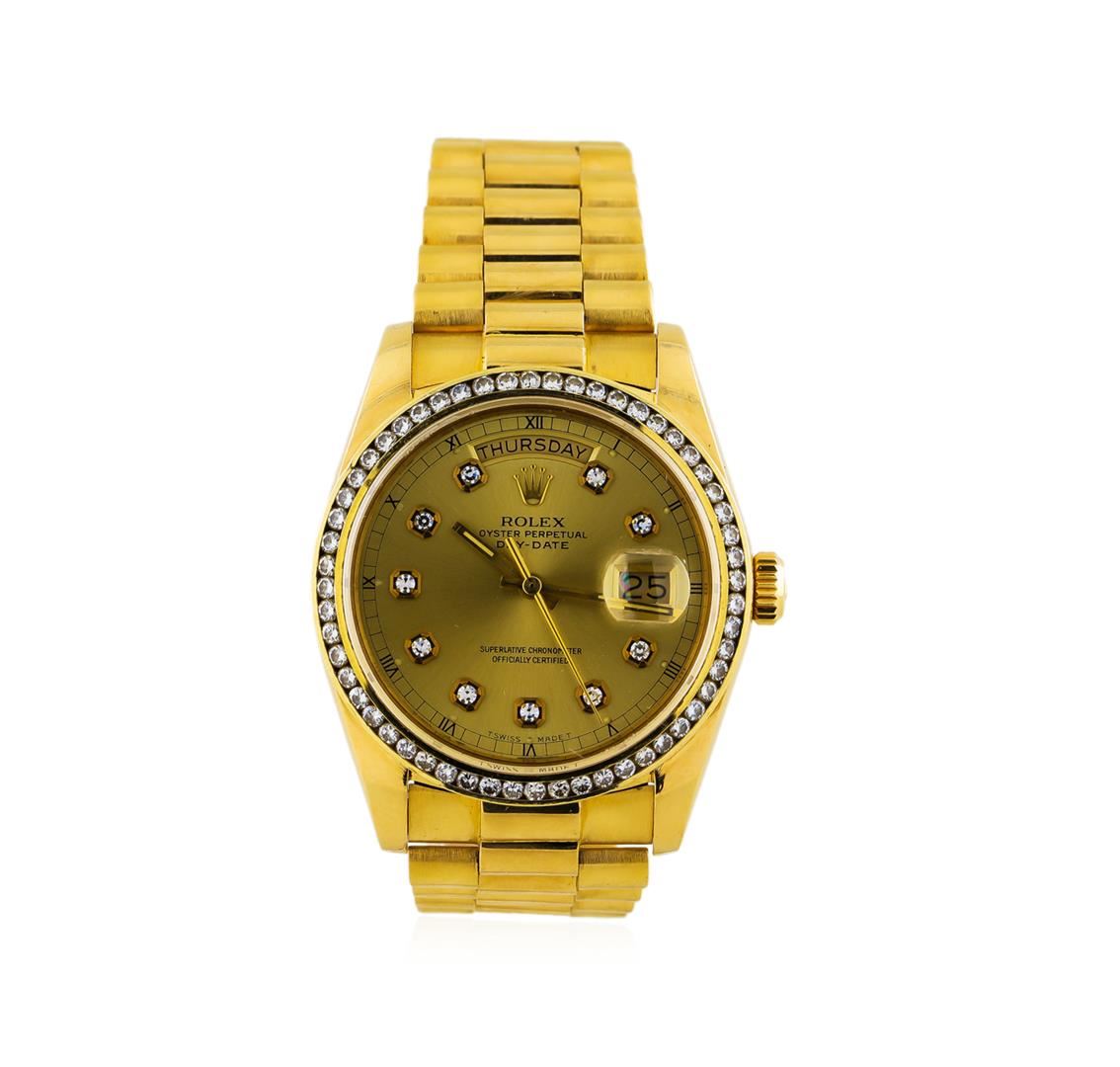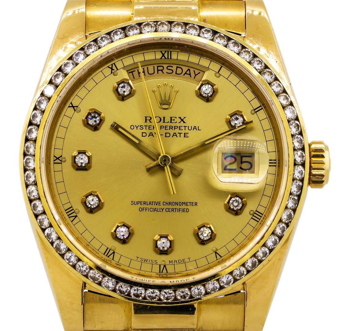 One gents, Rolex DayDate Model the President wristwatch electronically tested 18KT yellow gold, Swiss Hallmarked Case: 36mm oyster, Crown: twin lock with logo, non-factory Custom Bezel: diamond set, non-factory Custom Crystal: synthetic sapphire cyclops lens. Circa: 1984.Movement: superlative chronometer, Rolex signed Dial: Champagne color, with baton hands, & diamond markers, Calendar: single-quick set, President Bracelet: 18KT yellow gold, bright finish, Condition: G-5 Fine. Seven and one third inch length. Swiss & Rolex Hallmarked concealed deployment clasp, with logo Containing: Fifty Six prong set round brilliant cut diamonds, approximate total weight equals 1.65ct. Set & graded in the custom bezel. Clarity: VS-1 to VS-2 Average. Color: H - I. Total Weight of Diamonds 1.65ct. Total Weight of Watch 135.54gm. This watch comes with Rolex Box. AIG Appraised at $23,000.00.