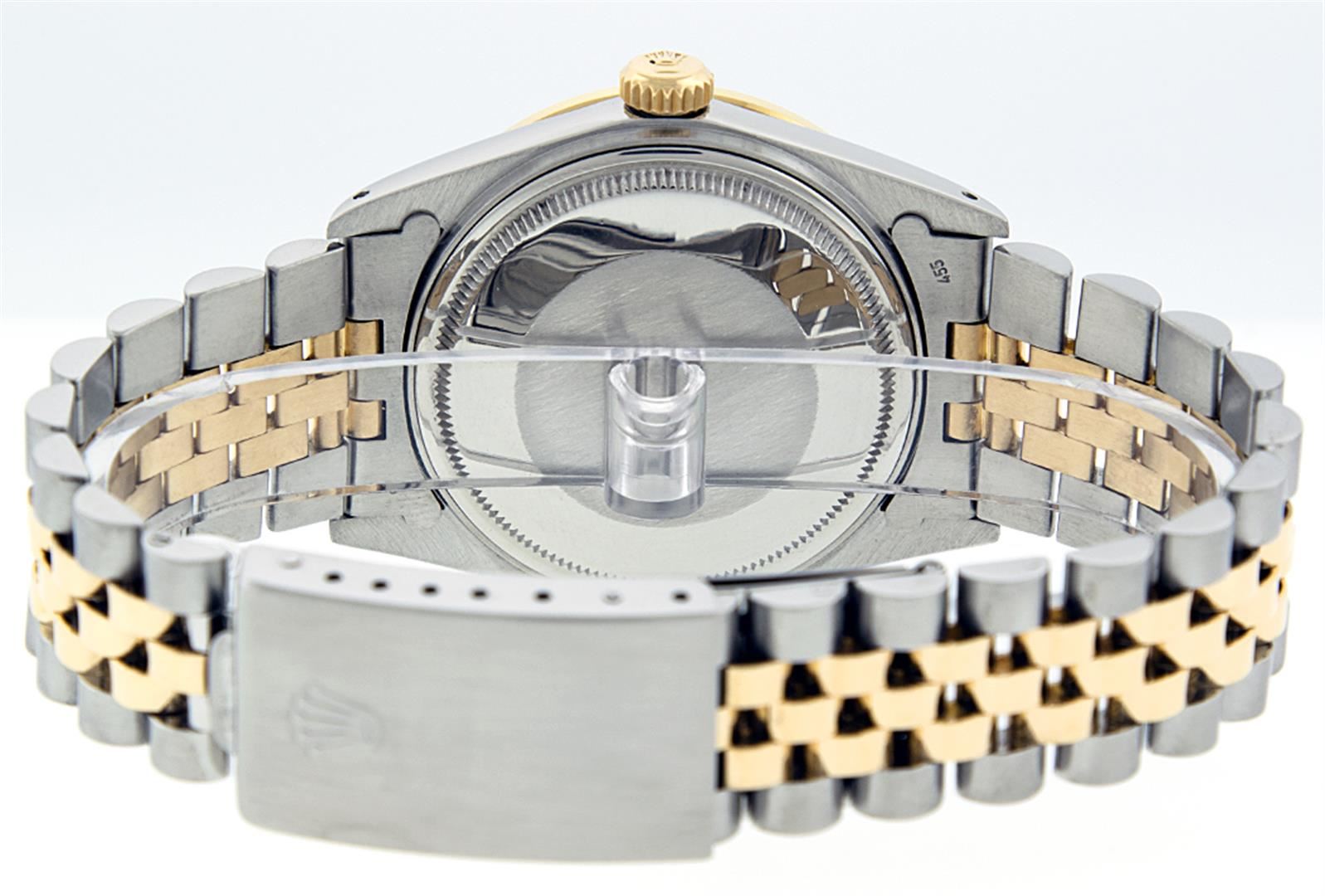 One Men's Two Tone Rolex Datejust Polished, Serviced & Electronically Tested, 14K Yellow Gold & Stainless Steel Case:36mm, 14K Yellow Gold Crown, Custom Bezel: 18K Yellow Gold Sapphire Beadset Diamond Bezel, Diamond Count: 36 Diamonds + 4 Sapphires Total Weight 1.00 Carat, Clarity: Si-VS, Color: G to H. Custom Crystal: Synthetic Sapphire Cyclops Lens. Movement: Automatic Winding Movement Caliber 3035. Custom Dial: Blue Dial Set With Diamond Hour Markers, 10 Diamonds in Dial G To H In Color, Si-VS Clarity, Date Window: 3 O'clock Position Date Display, Quickset, Model: 16013 Condition: G-6 Extra Fine. Bracelet: Two Tone 14K Yellow Gold & Stainless Steel Jubilee. Bright Polish. 7.0 Inch Length, Adjustable. Standard Clasp, With Rolex Logo.