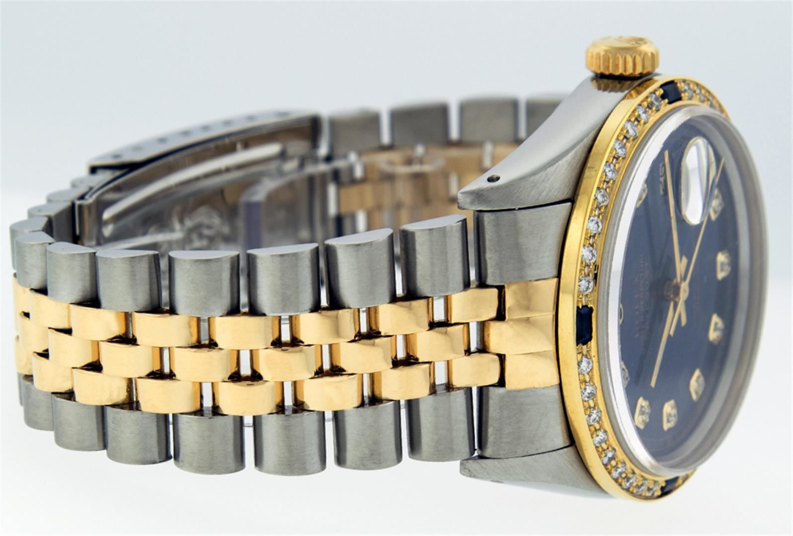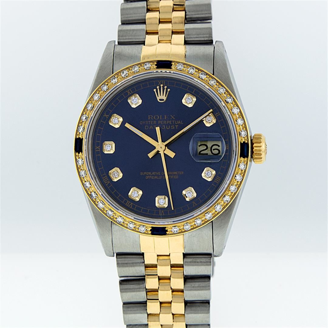 One Men's Two Tone Rolex Datejust Polished, Serviced & Electronically Tested, 14K Yellow Gold & Stainless Steel Case:36mm, 14K Yellow Gold Crown, Custom Bezel: 18K Yellow Gold Sapphire Beadset Diamond Bezel, Diamond Count: 36 Diamonds + 4 Sapphires Total Weight 1.00 Carat, Clarity: Si-VS, Color: G to H. Custom Crystal: Synthetic Sapphire Cyclops Lens. Movement: Automatic Winding Movement Caliber 3035. Custom Dial: Blue Dial Set With Diamond Hour Markers, 10 Diamonds in Dial G To H In Color, Si-VS Clarity, Date Window: 3 O'clock Position Date Display, Quickset, Model: 16013 Condition: G-6 Extra Fine. Bracelet: Two Tone 14K Yellow Gold & Stainless Steel Jubilee. Bright Polish. 7.0 Inch Length, Adjustable. Standard Clasp, With Rolex Logo.