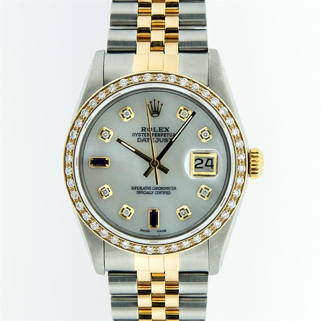 One Men's Two Tone Rolex Datejust Polished, Serviced & Electronically Tested, 14K Yellow Gold & Stainless Steel Case:36mm, 14K Yellow Gold Crown, Custom Bezel: 18K Yellow Gold Beadset Diamond Bezel, Diamond Count: 44 Diamonds Total Weight 1.00 Carat, Clarity: Si-VS, Color: G to H. Custom Crystal: Synthetic Sapphire Cyclops Lens. Movement: Automatic Winding Movement Caliber 3035. Custom Dial: Mother Of Pearl Dial Set With Diamond Hour Markers, 8 Diamonds + 2 Sapphire Baguettes in Dial G To H In Color , Date Window: 3 O'clock Position Date Display, Quickset, Model: 16013 Condition: G-6 Extra Fine. Bracelet: Two Tone 14K Yellow Gold & Stainless Steel Jubilee. Bright Polish. 6.5 Inch Length, Adjustable. Standard Clasp, With Rolex Logo.