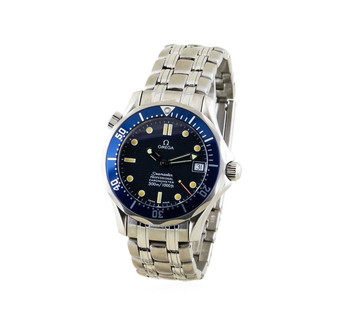 One gents, combination cast & die struck Omega Seamaster Professional wristwatch electronically tested Stainless Steel, Case: 36mm diameter, Water resistant: 300 meters / 1000 feet, with a Helium escape valve on the case at the 10 o'clock position. Case Back: the Omega Seamaster logo is presented in high relief. Locking Crown: scalloped with logo, set within protective shoulders, Bezel: 7Blue aluminum unidirectional time lapse, Crystal: Domed anti-reflective scratch resistant sapphire crystal. Movement: automatic, Omega signed Dial: Blue Wave, luminous hands & indices, Calendar: 3 o'clock display date window, Omega Bracelet: Stainless Steel link, with a divers extension buckle for fitting over a wetsuit, Condition: G-6 Extra Fine. Seven and one half inch length, adjustable. Double locking deployment clasp, with logoTotal Weight of Watch 134.87gm. AIG Appraised at $3,330.00.