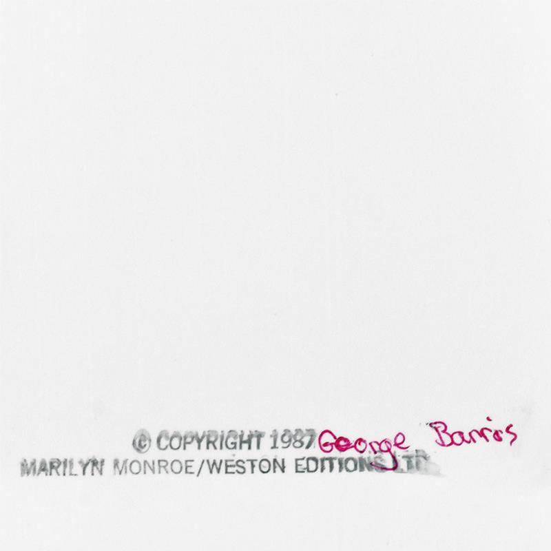 "Marilyn Monroe: The Last Shoot" is a photograph printed from the original negative taken by George Barris (1922-2016). This photo is part of a series entitled "The Last Photos"; they were taken in 1962 just two weeks before Monroe's death and are considered the last photos ever taken of the icon. This piece is numbered inverso and hand signed by the photographer. This photo bears the Edward Weston copyright stamp inverso and includes Letter of Authenticity. Measures approx. 8" x 10" (image).