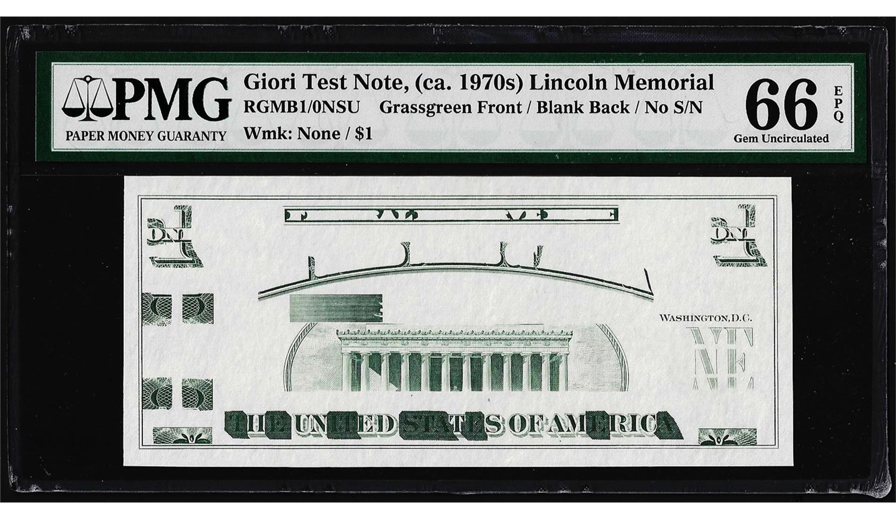 One Giori Test Note Lincoln Memorial PMG Gem Uncirculated 66EPQ. PMG Certified.