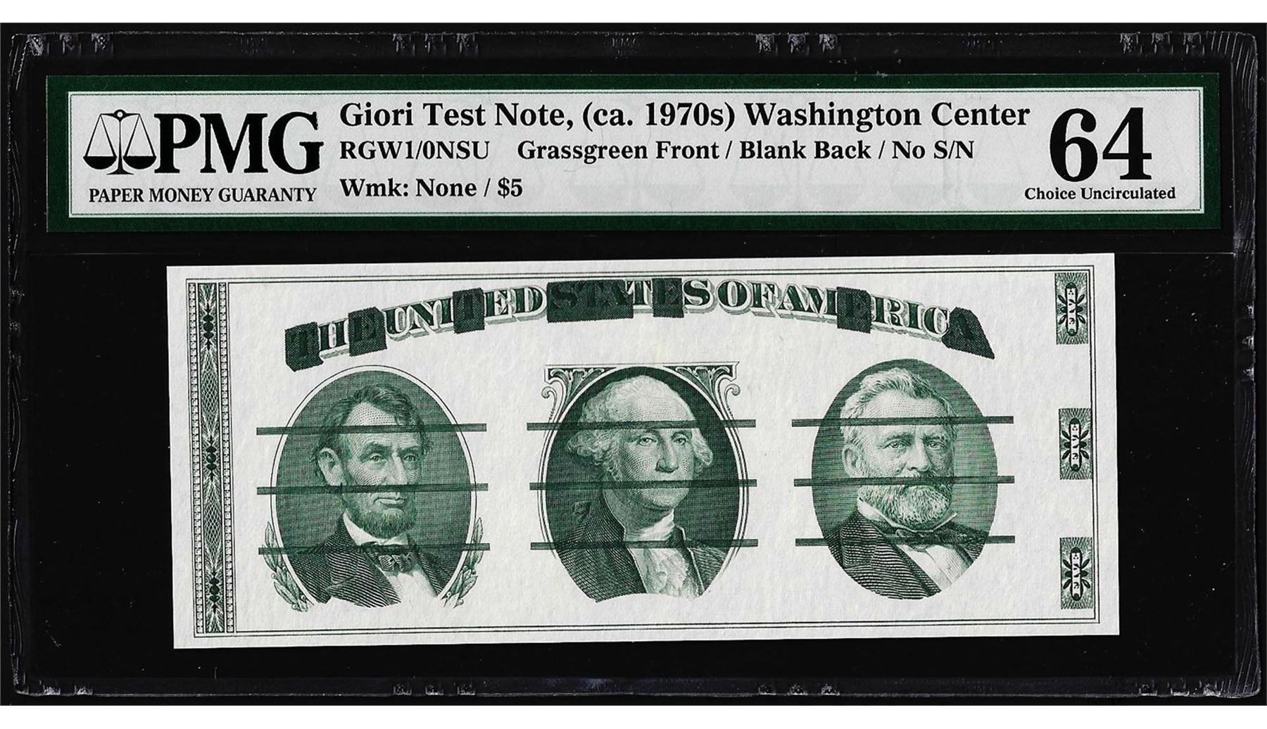 One Giori Washington Face Test Note PMG Choice Uncirculated 64. PMG Certified.