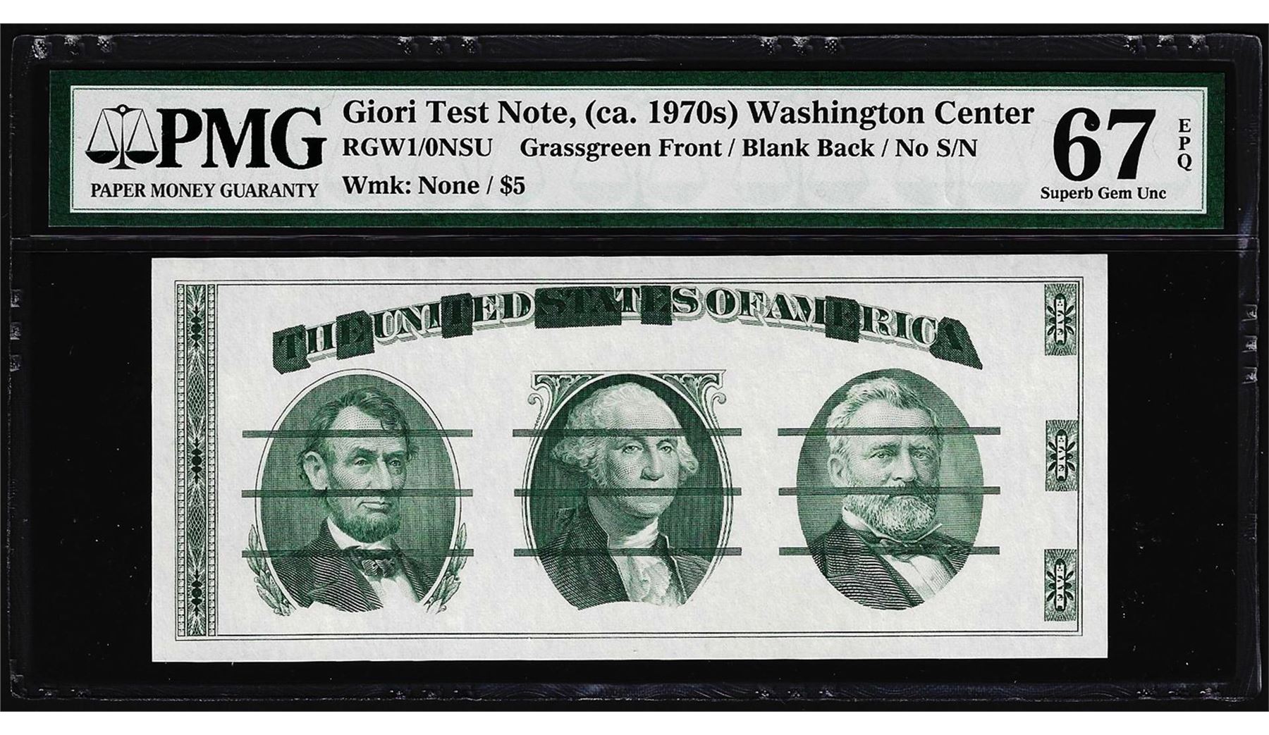 One Giori Washington Face Test Note PMG Superb Gem Uncirculated 67EPQ. PMG Certified.