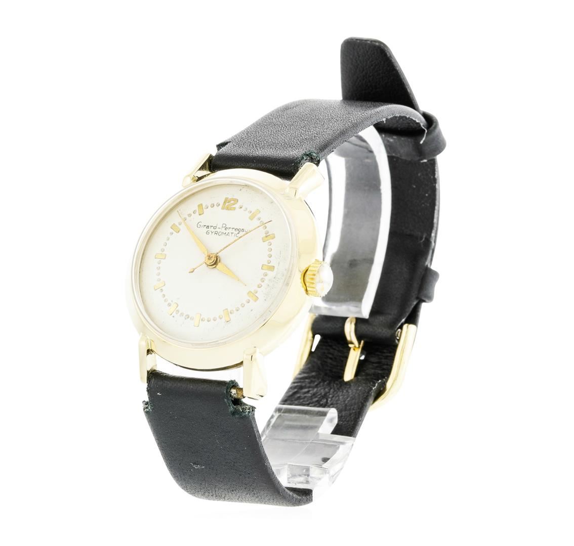 One vintage Girard-Perregaux wristwatch with a black leather strap. The watch features 14KT yellow gold and has a personalized engraving on the case back, saying "Dick, with love Mary 6-23-51". Dial: Cream colored with gold stick markers and pointed, baton-type hands. Crystal: Acrylic.