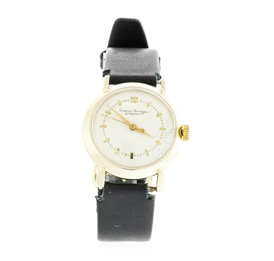One vintage Girard-Perregaux wristwatch with a black leather strap. The watch features 14KT yellow gold and has a personalized engraving on the case back, saying "Dick, with love Mary 6-23-51". Dial: Cream colored with gold stick markers and pointed, baton-type hands. Crystal: Acrylic.