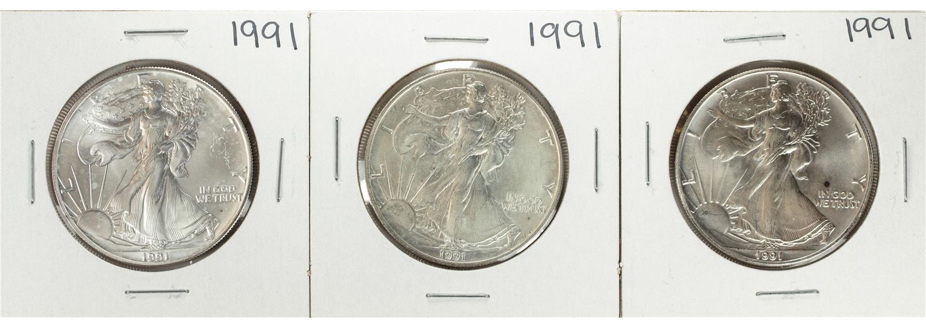 One Group of (3) 1991 $1 American Silver Eagle Coins.