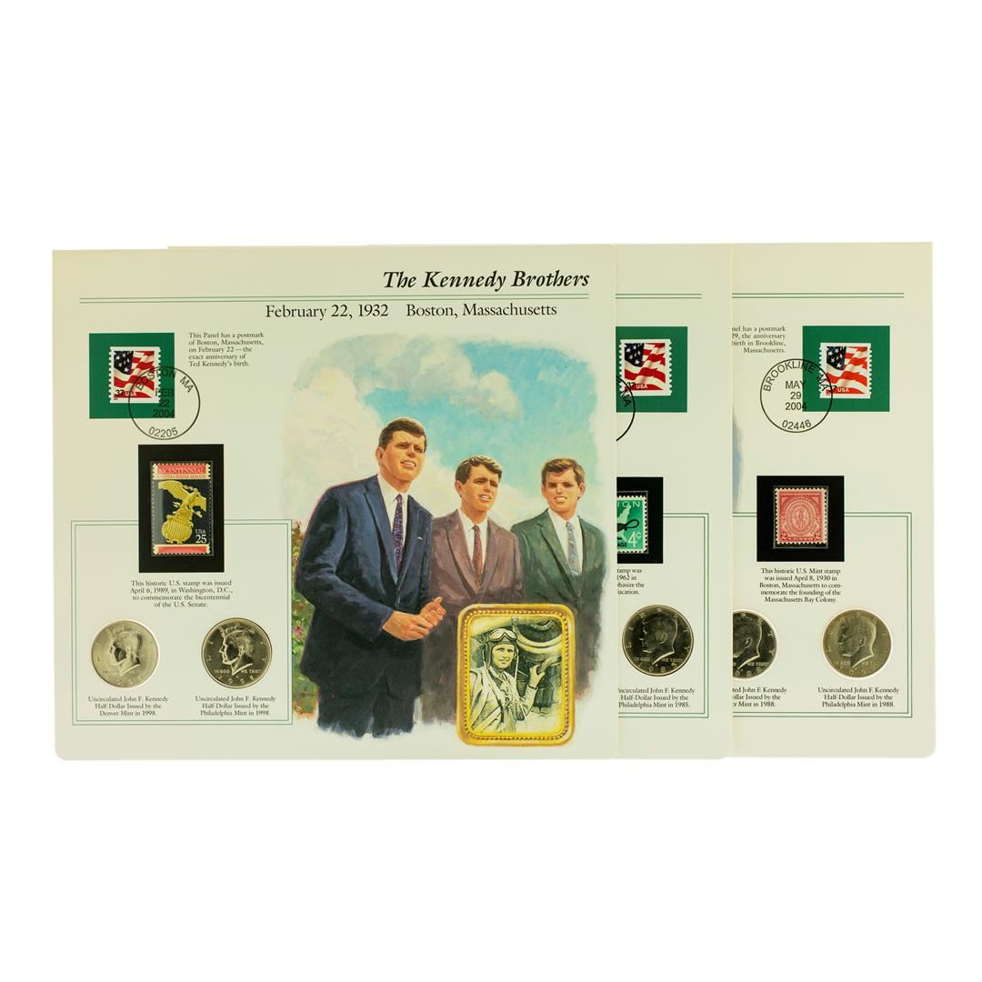Group of (3) Kennedy Half Dollar Coin & Stamp Commemorative Sets