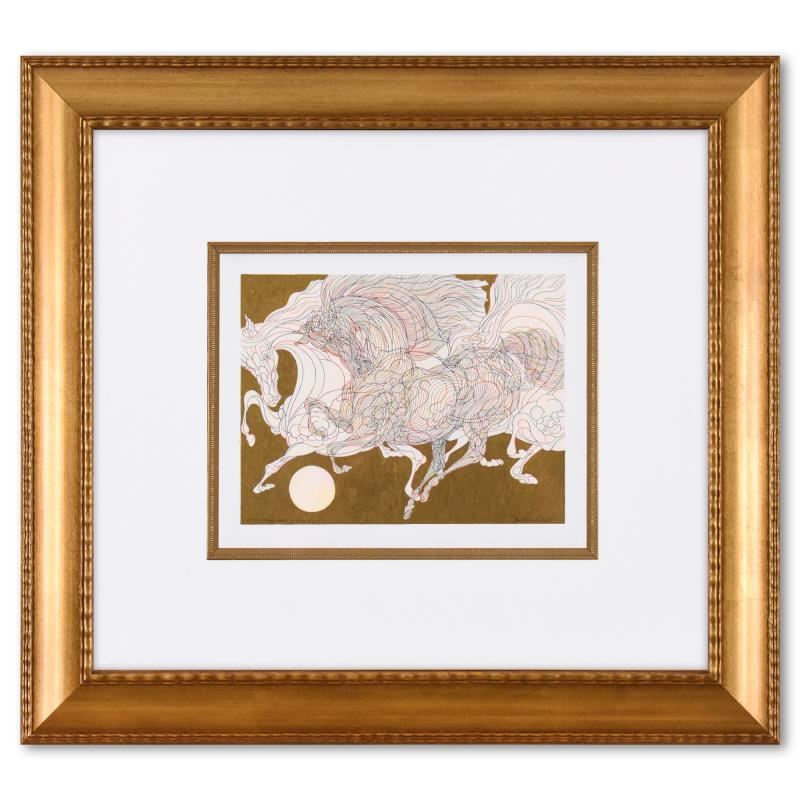 "Etude Quatre Grues" is an original hand colored drawing on paper with hand laid gold leaf by Guillaume Azoulay, hand signed by the artist. This piece comes custom framed. Includes Letter of Authenticity. Measures approx. 26" x 23" (frame); 11" x 8" (image).