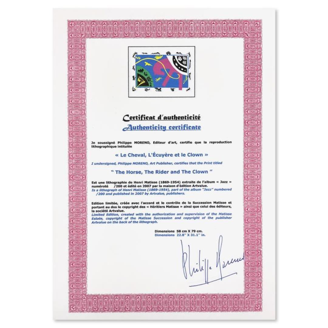 "Le Cheval, L'Ecuyere et le Clown" is a limited edition lithograph by Henri Matisse (1869-1954). This piece comes from an edition of 200 authorized by the Matisse Estate; the edition number is not on the piece itself but on the certificate. This piece comes custom framed. Includes Certificate of Authenticity. Measures approx. 37" x 29" (frame), 31" x 23" (image).